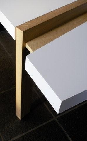 Bij de klassieke ladetafel maken de opbergladen slechts oppervlakkig deel uit van het gehele meubel. Door de opbergruimte bovenop het tafelblad te plaatsen, wordt dit geïntegreerd in de totaliteit van het meubel. In gesloten toestand biedt Table Tige rommelvrije werkruimte terwijl in open toestand, wanneer de lades worden open geschoven, het werkoppervlak vergroot wordt zonder het visuele beeld te verstoren.