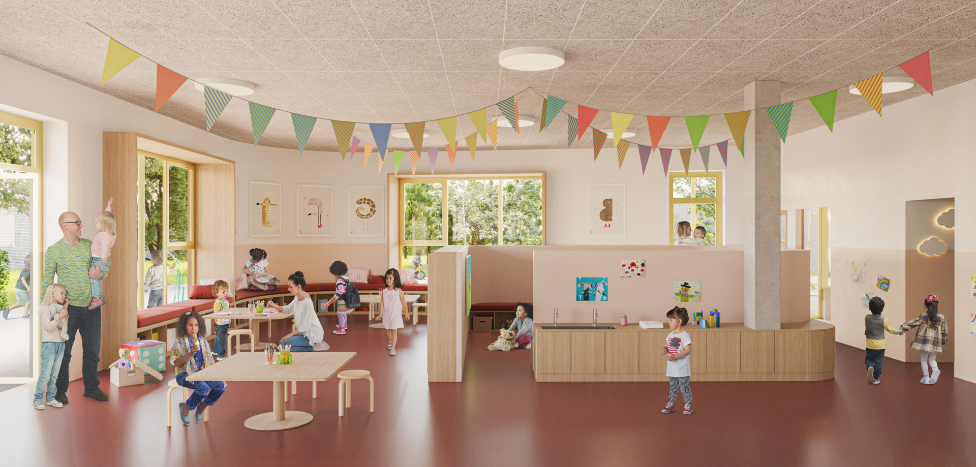 “Wij zetten heel bewust in op één gezamenlijke startplek. Je start de dag samen en je voelt meteen: dit is één school, één huis”, aldus directeur Bérénice Noé. Dat versterkt volgens haar het familiale karakter van de school en maakt ontmoeting vanzelfsprekend. Ook de toekomstige integratie van een kinderdagverblijf op de site past in dat samenwerkingsverhaal en het idee van dagelijks gedeeld gebruik.
