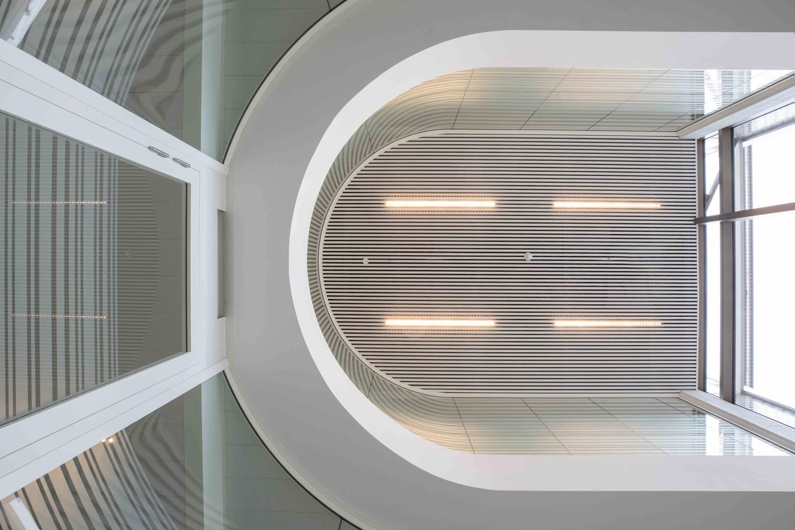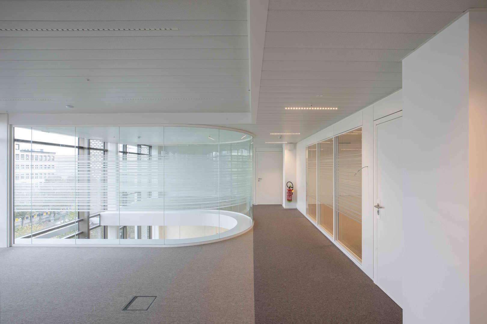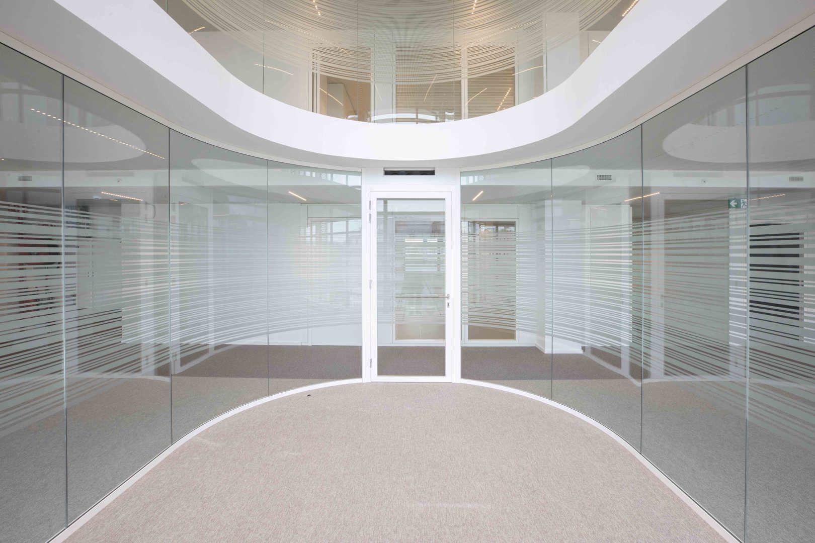 Voor de interne afwerking leverde Beddeleem de gebogen JB 4000 enkelbeglaasde wanden. Deze maatoplossing vereiste intensieve R&D, engineering en productie-expertise. De gebogen glaswanden sluiten naadloos aan bij de architecturale visie van het ontwerpteam en illustreren hoe flexibele wandsystemen complexe vormen en hoge esthetische eisen kunnen ondersteunen.