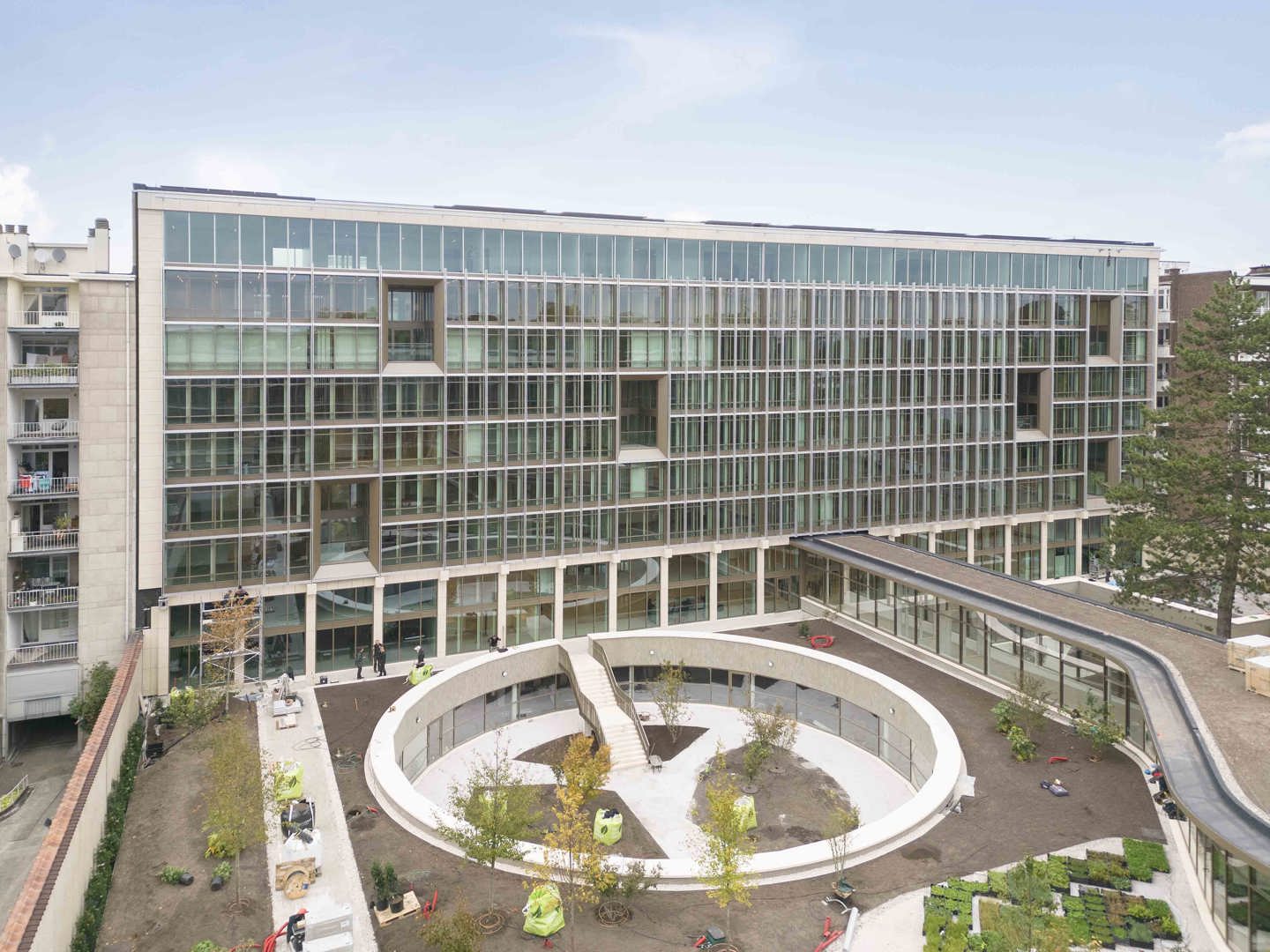 Ook de buitenruimte speelt een cruciale rol. Het binnengebied wordt heringericht als een groene long van 5.035 m². Met de aanplant van 182 nieuwe bomen en struiken krijgt de site niet alleen een ecologische meerwaarde, maar ook een duidelijke landschapsidentiteit.