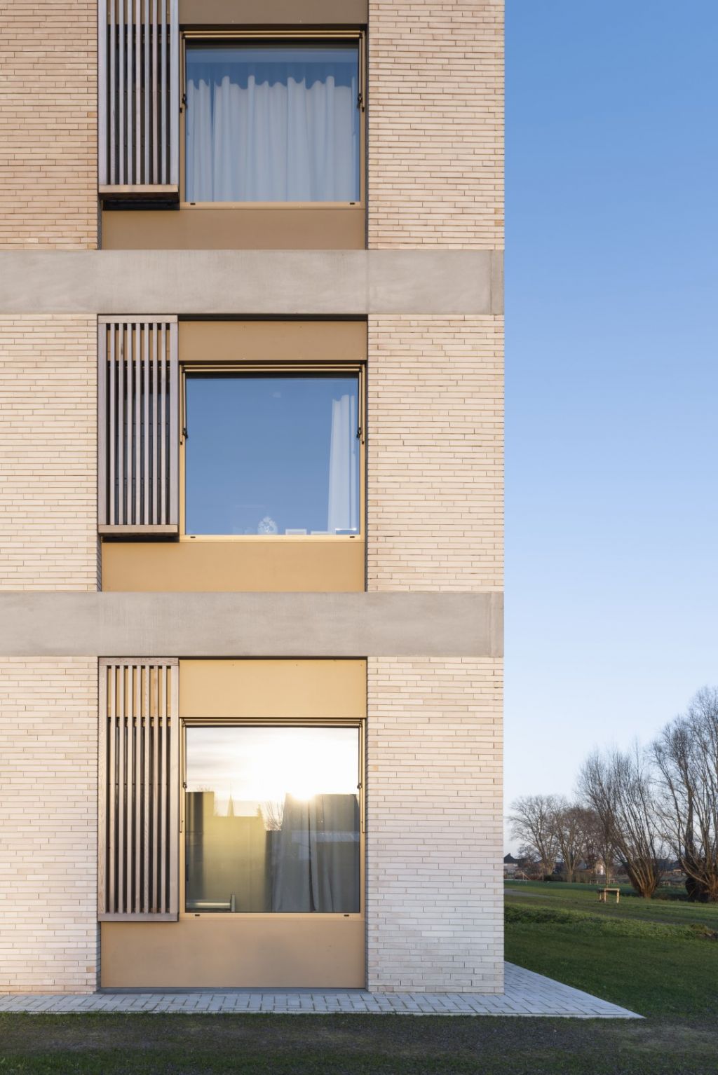 Een eenvoudige vormgeving, ecologische materialen en harmonieuze kleuren reiken de hand naar de omgeving. De buitenkant van de woonhuizen krijgt een kleinkorrelige, witbeige baksteen en aluminium schrijnwerk, verticaal onderbroken door houten zonweringen en horizontaal door betonnen banden.