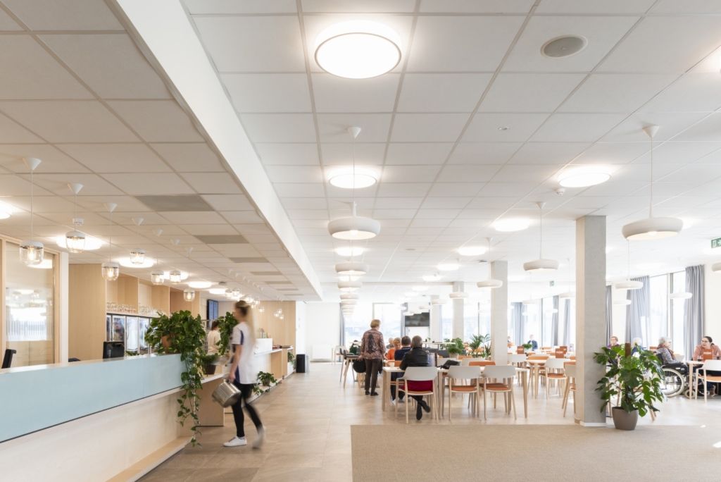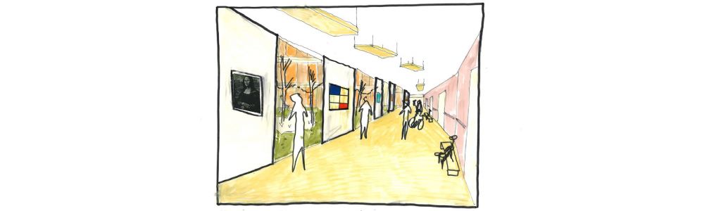Alle gemeenschappelijke centrale functies strekken zich op het gelijkvloers uit langs een verbindende as (de ‘Ramblas’). Ze omvatten onder meer de cafetaria met een groot overdekt terras gelinkt aan de tuin, het onthaal en de administratie en verlenen toegang tot de verticale circulatie via trappen en liften.