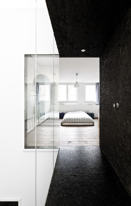 In eerste instantie was er de vraag naar meer licht in het midden van het huis, omdat het zoals veel huizen in Brussel leed aan een tekort aan helderheid in de tussenliggende delen. Het antwoord van Label Architecture ging nog verder dan het programma. Vanaf de eerste verdieping werd het trappenhuis op de drie hoogste niveaus helemaal verwijderd. Een opengewerkte trap verbindt de eerste twee verdiepingen en belemmert slechts gedeeltelijk de lichtdoorstroming. Op elke verdieping werden wandhoge ramen gebruikt, hetgeen een echte fysieke sensatie, niet ver verwijderd van hoogtevrees, teweegbrengt. Verschillende etages zijn doorboord met kleine ronde openingen die het mogelijk maken om te communiceren van de ene verdieping naar de andere. Achter de ramen werden de lagers in zwart gebeitst OSB bekleed, hetgeen een spiegel creëert voor degenen die vanuit de tegenovergestelde openingen kijken. Tegenover deze openingen werden tegen de scheidingswand spiegels geplaatst. Door gebruik te maken van deze onverwachte verbindingen vinden de familieleden elkaar eenvoudig. Lewis Carroll waardig heeft het atrium speciale verlichting, gescreend door een luifel in Barrisol. En als de avond valt nemen neonlichten achter een scherm van melkglas de taak van het zonlicht over.