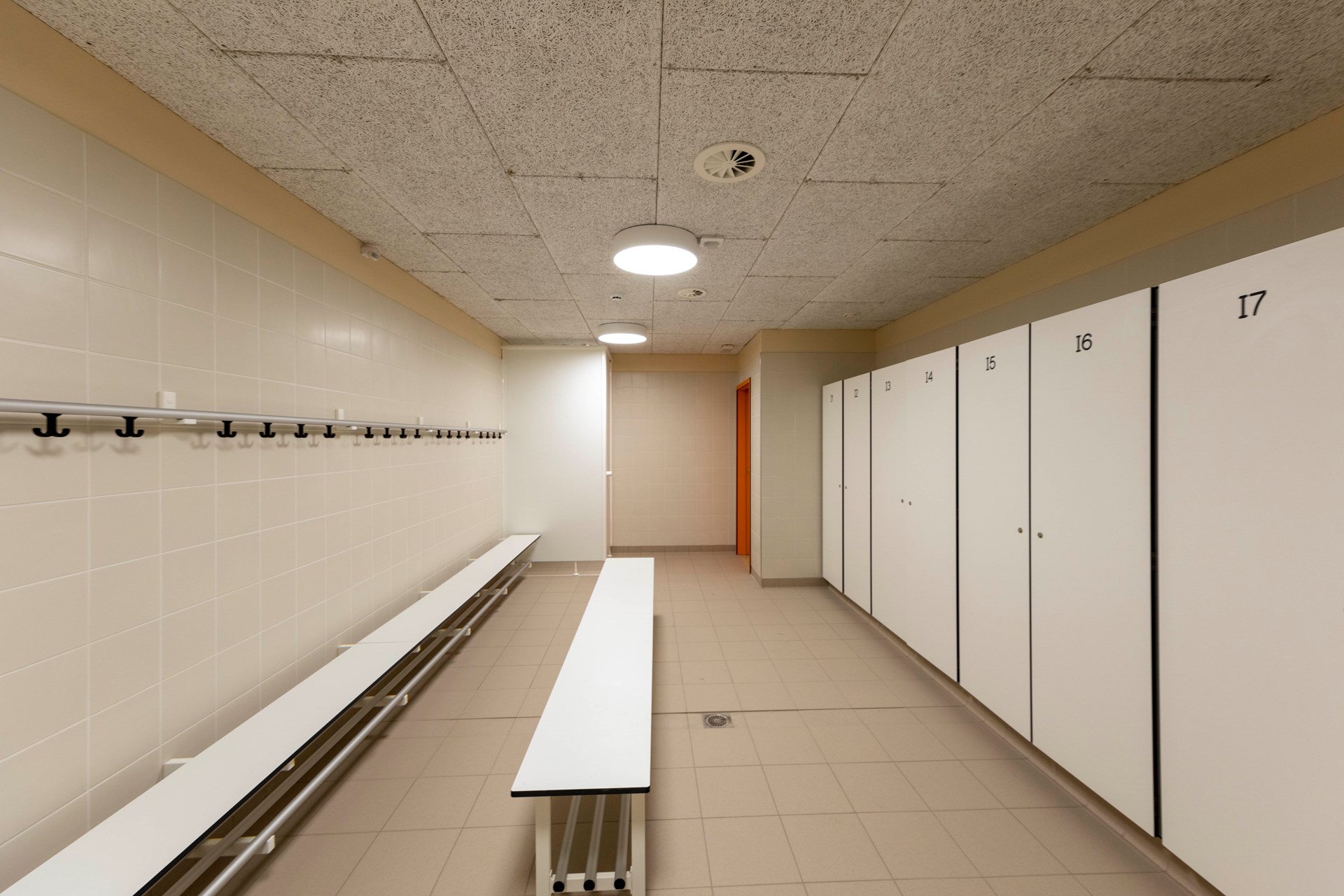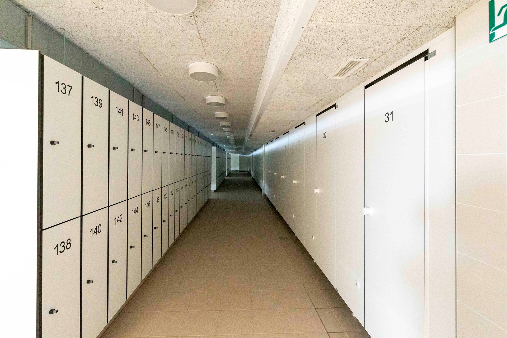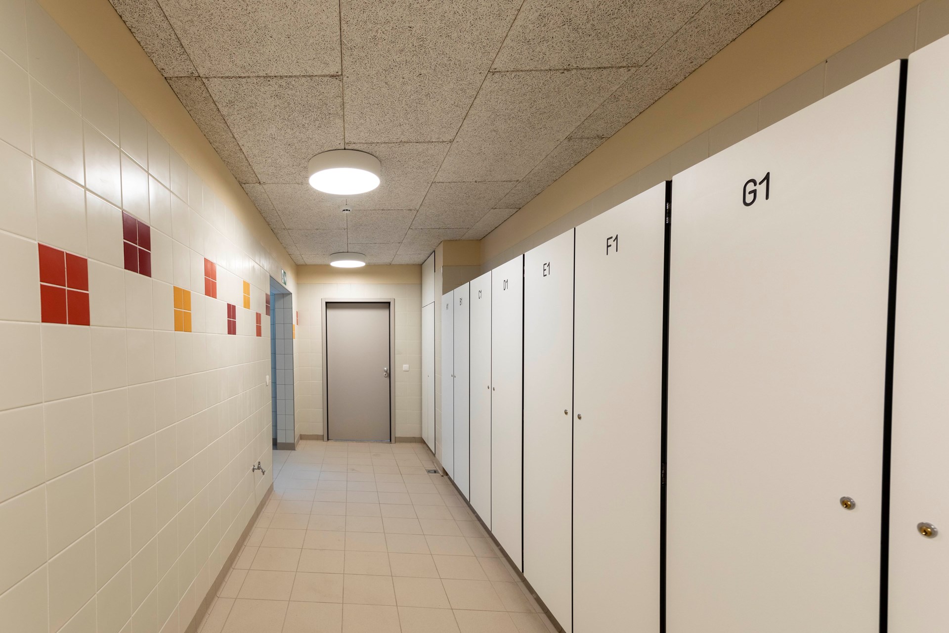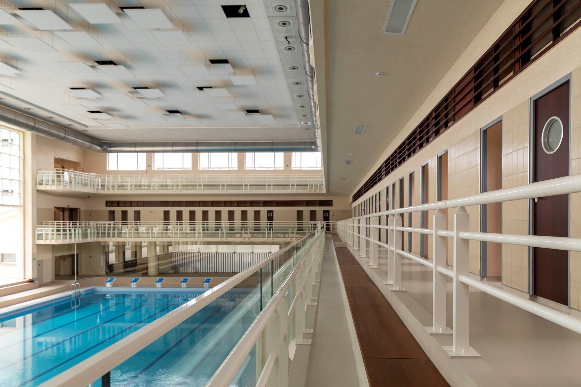 Ook de indeling van het zwembad werd grondig herdacht om de zone met schoenen te scheiden van de blote voetenzone, wat de hygiëne ten goede komt. De gemeenschappelijke kleedkamers zijn nu op de benedenverdieping. De kleedhokjes op de tussenverdieping werden gereconstrueerd en er werden berghokjes geïnstalleerd. Verder zijn er nieuwe kleedkamers voor families en personen met een handicap ingericht. De toegang tot het zwembad vanaf de kleedhokjes aan weerszijden van het kleine bad werd volledig heringericht om plaats te maken voor douches, toiletten en voetbaden. De douches tussen de twee baden zijn verdwenen.