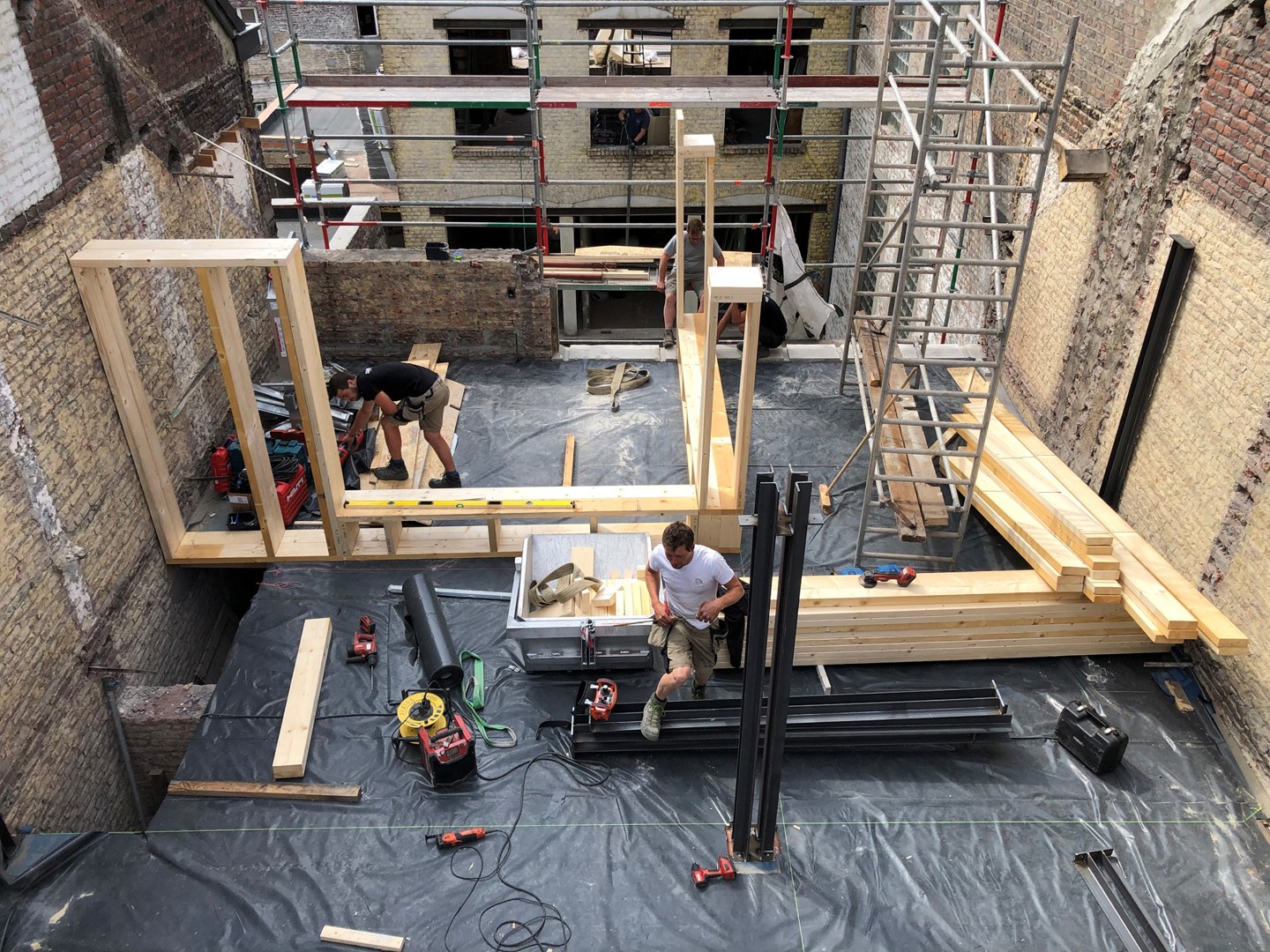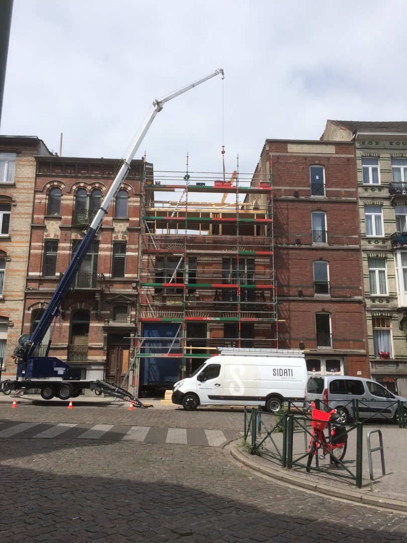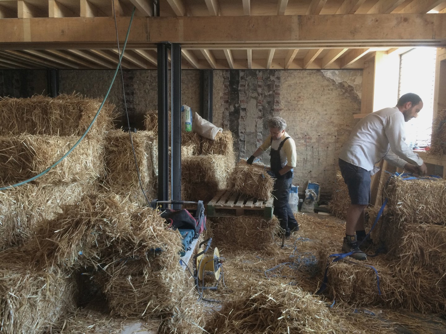 "Helaas kennen nog niet veel Brusselse aannemers de producten van BC materials. Daarom werd onze werf gebruikt als een scholingswerf voor de opleiding van vijf Brusselse aannemers die zich wilden verdiepen in circulair bouwen. Want de leempleisters van BC materials waren niet het enige circulaire aan de werf, de hele renovatie kan bestempeld worden als circulair. De workshop werd georganiseerd in samenwerking met BC materials en Het Leemniscaat, een stukadoorsbedrijf gespecialiseerd in leem."