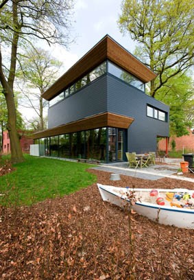 In de bosrijke omgeving van Mariakerke realiseerde architect Giovanni Declercq onlangs een passiefhuis. De uitdaging bestond erin om het omringende groen zo veel mogelijk bij de woning te betrekken. Met behulp van de ‘Alterna’-leien, ontwikkeld door Eternit, verkreeg de woning een open en massief, maar toch discreet karakter.