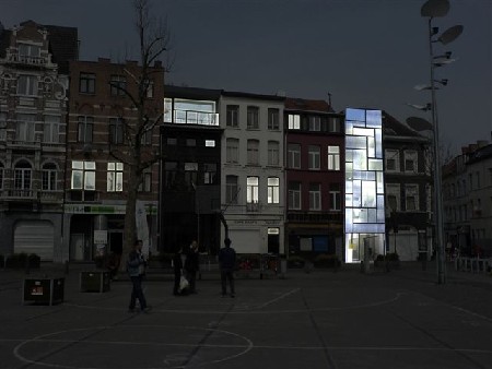Momenteel nadert een tweede glazen woning van dit architectenkoppel zijn voltooiing. Vlaamsearchitectuur.be ging er een tijdje geleden in primeur al een kijkje nemen samen met een camaraploeg van Architv. De rijwoning wordt gebouwd op het De Coninckplein. Ze noemen het zelf een Mondriaan-woning omdat het opgebouwd is uit een dubbele glazen gevel die vergelijkbaar met de schilderijen van Mondriaan onderverdeeld zijn in verschillende vlakken. Dankzij de geschrankte overlapping van die twee rasters wordt de privacy gewaarborgd maar blijft de transparantie voor de bewoners optimaal.