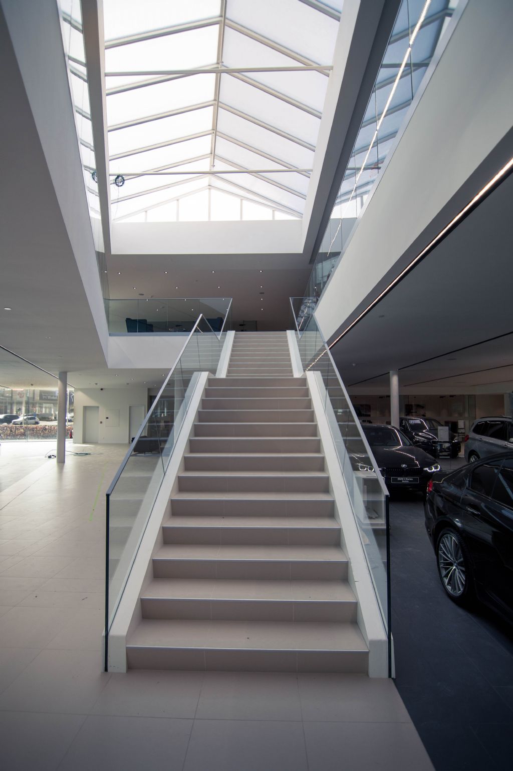 De bouw van garages met showrooms is een van de voornaamste specialismen van ASK Romein. Met de BMW-concessie in Merksem mag de firma opnieuw een knappe realisatie toevoegen aan haar palmares. “De voornaamste constructieve uitdaging in dit project was dat de horizontale gevelvlakken – bekleed met witte aluminiumcassettes van ALUCOBOND – zo slank mogelijk moesten blijven met het oog op een strakke en elegante uitstraling, terwijl de luifels in het verlengde van de eerste verdieping en het dak maar liefst 4 meter overkragen. Behalve S235-staal hebben we ook S355-staal gebruikt om dit mogelijk te maken”, aldus Gunther Vranken. “Voorts vergde ook de integratie van het embleem van BMW Jorssen in het gevelbeeld het nodige rekenwerk. In totaal hadden we 295 ton staal nodig om de nieuwe concessie te realiseren. De primaire structuur is brandwerend geschilderd en de luifelstructuur gegalvaniseerd. De trap in de toonzaal is een paradepaardje. De trap is 1,9 meter breed, volledig betegeld en uitgerust met een glazen leuning. Aangezien de constructie heel wat gewicht moet kunnen dragen, is ze opgebouwd uit een zware staalstructuur, waarbij de tredes en tegentredes uit vlakke staalplaten bestaan.”