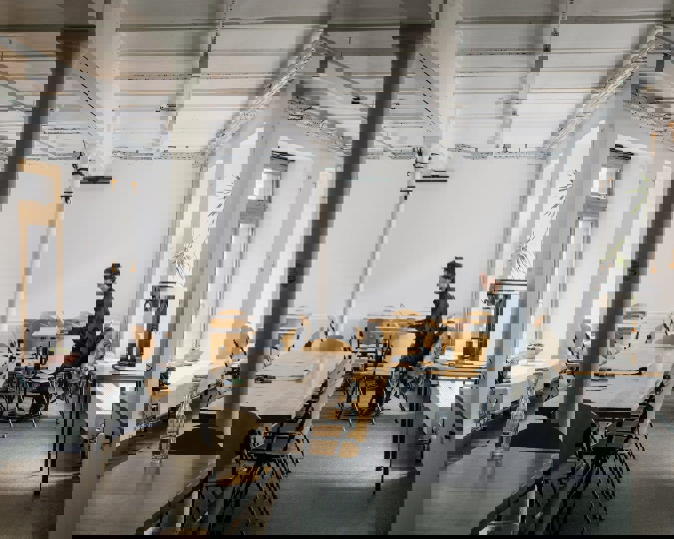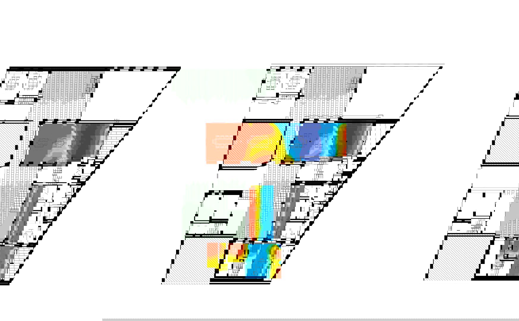 Een sleutelcomponent in de klimaatstrategie is het gebruik van lucht als ontwerpmaterie. De ventilatie wordt per ruimte afzonderlijk gecontroleerd, zodat het gebouw verschillende bezettingen en werkvormen aankan zonder overal dezelfde intensiteit of infrastructuur te vragen. Tegelijk beperkt deze keuze het aantal ventilatieschachten en vermijdt ze onnodige structurele ingrepen in het bestaande pand. Daarbovenop wordt het systeem gecombineerd met natuurlijke ventilatieve koeling, zodat comfort niet enkel uit mechanische sturing komt maar ook uit het activeren van bestaande mogelijkheden.