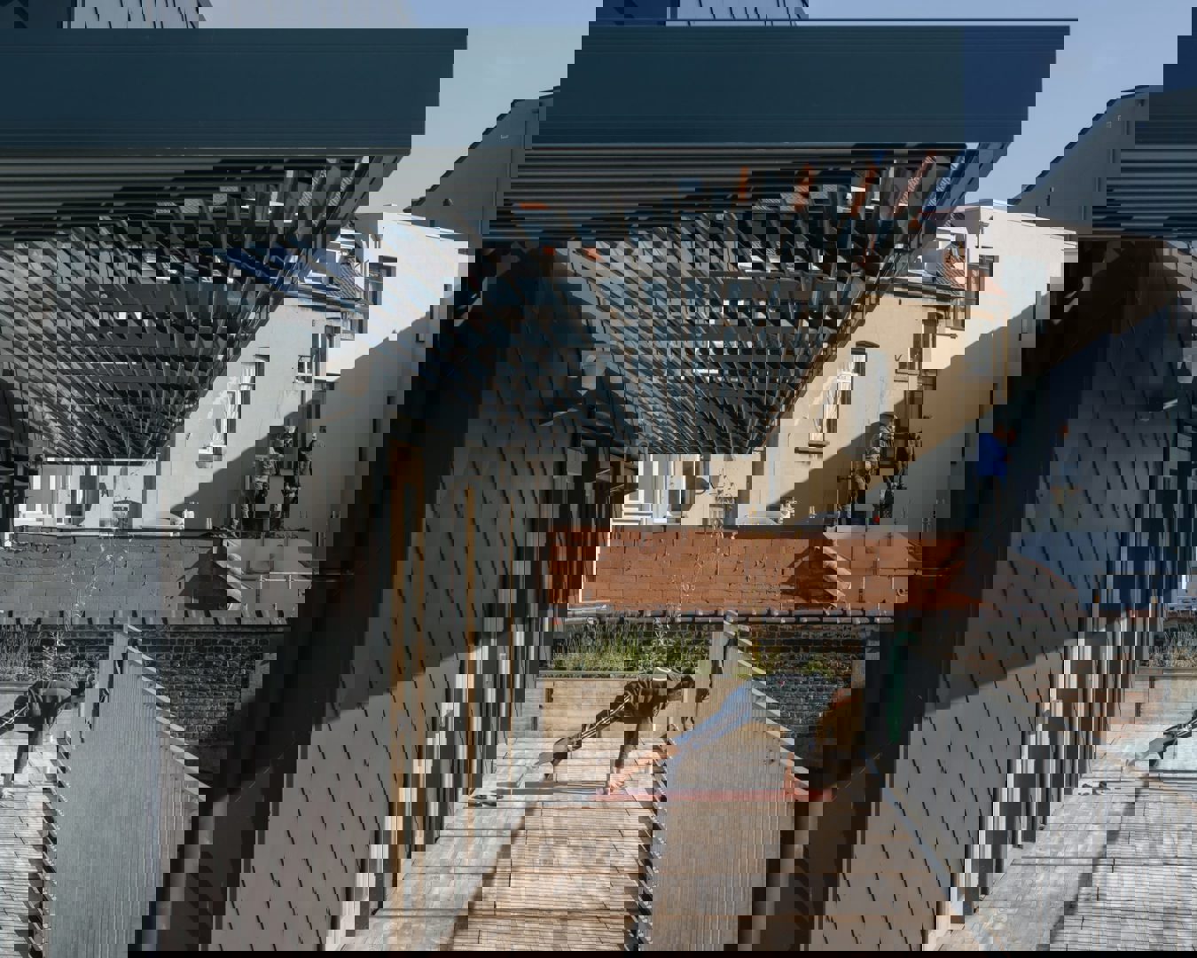 Die natuurlijke koeling wordt ondersteund door een eenvoudig monitoringsysteem dat ramen automatisch laat openen en sluiten op basis van binnen- en buitentemperatuur, wind en CO₂-niveau. Zo blijft de luchtkwaliteit op peil en wordt oververhitting beperkt, met slechts een bescheiden technologische ingreep. Precies die mix van sufficiëntie, gedifferentieerde klimaten en slimme, lichte sturing verklaart de award: het Greenpeace-hoofdkantoor toont hoe een low-tech renovatie kan uitmonden in een hoogwaardig binnenklimaat dat meebeweegt met gebruik, seizoenen en stedelijke context.