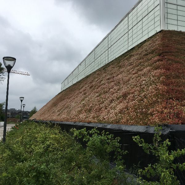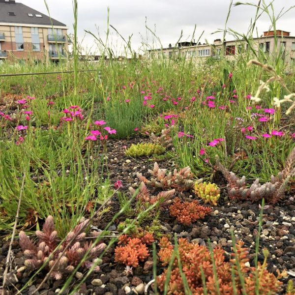 Vice Verda stond in voor de groendaken, en deed daarbij een beroep op de oplossingen van ZinCo Benelux. De platte daken, met een oppervlakte van 4.800m², werden uitgevoerd met de systeemopbouw met ZinCo Floradrain FD25. Zo werd er een biodiversiteitsgroendak met sedum, kruiden en bloemen van gemaakt.