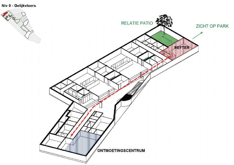 Volt breekt het bestaande rusthuis op de site af, maar voorziet wel nieuwe assistentiewoningen: de bewoners kunnen in het dienstencentrum eten. De parking plaatsen ze een stuk van het gebouw af. Die komt achter de serviceflats, zo wordt elke beweging naar het gebouw een korte wandeling door het park.