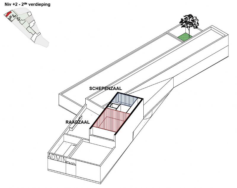 De organisatie van de publieke ruimtes op de gelijkvloerse verdieping kenmerkt zich door een aaneenschakeling van kleine ruimtes tot een groter geheel, een beeld van een tentendorp bracht hier inspiratie. De raadzaal en schepenzaal bekronen het gebouw.