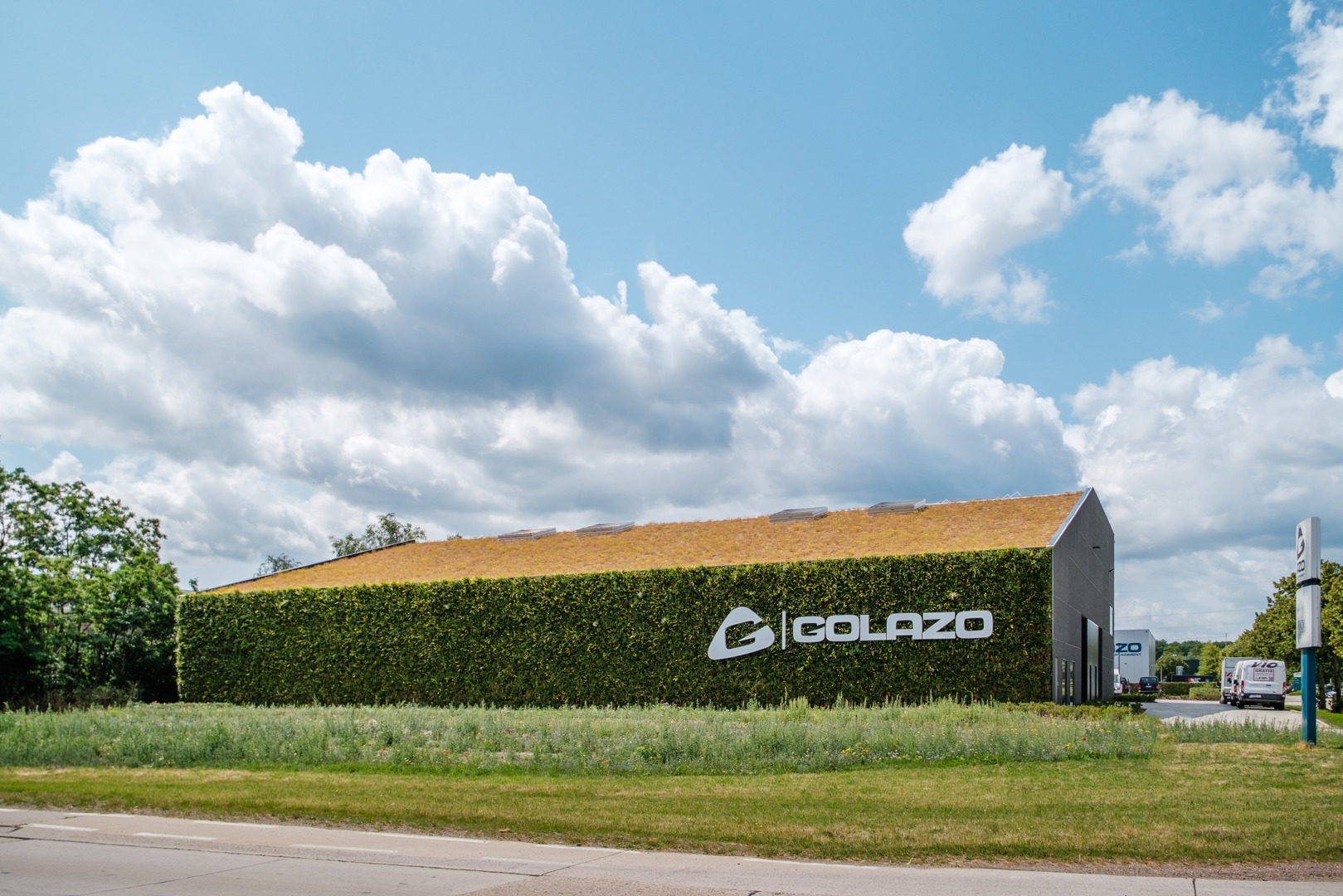 Sempergreen kan voor de SemperGreenwall uitpakken met een paar mooie referenties in ons land. Zo siert het groengevelsysteem de façade van het logistieke centrum van Golazo in Paal. De groengevel werd er gecombineerd met een groendak met zonnepanelen, regenwateropvang en laadpunten voor elektrische voertuigen. De SemperGreenwall moet de circulaire strategie van het internationale sportmarketing- en evenementenbureau mee onderlijnen.