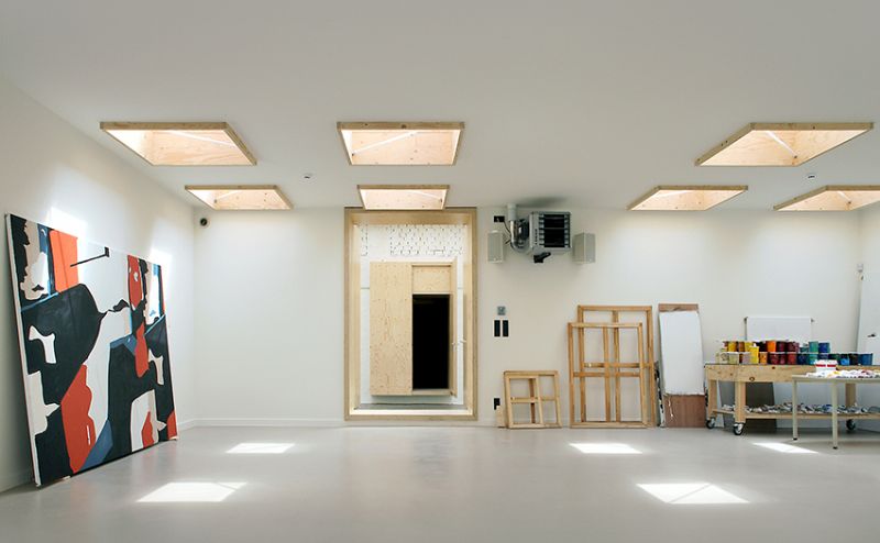 Zorgen voor voldoende licht in het schildersatelier was een uitdaging voor de architect. Door de aard van de bestaande woning was het niet makkelijk om kwalitatief schilderslicht te installeren. Een technisch rudimentaire installatie maakte het niet makkelijker. TL-armaturen verlichten het atelier. Er is geen centrale verwarming.