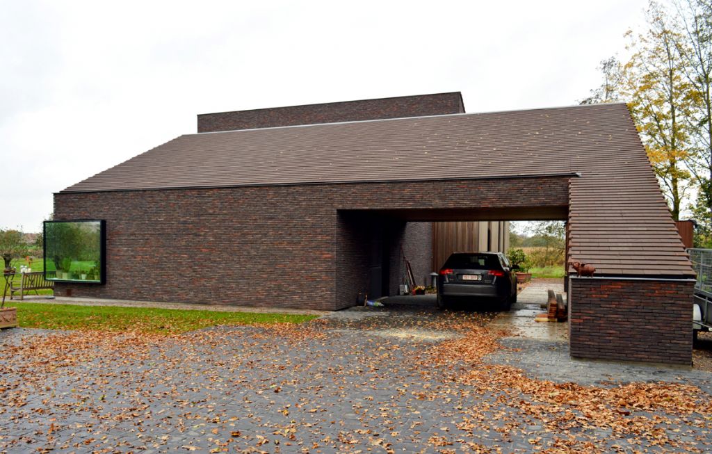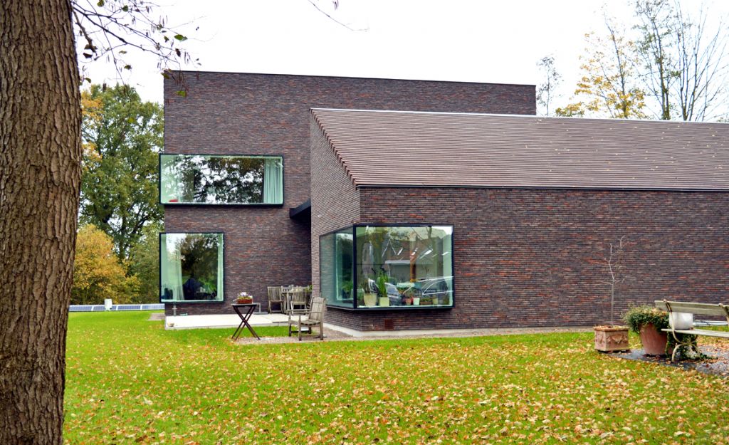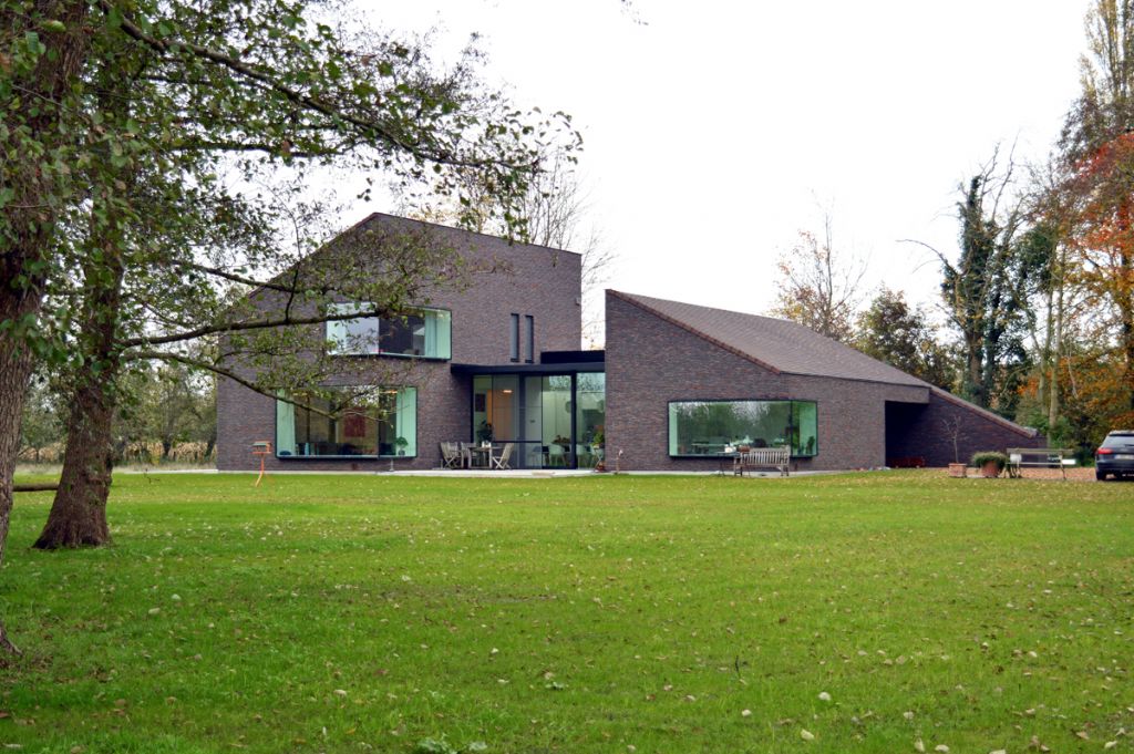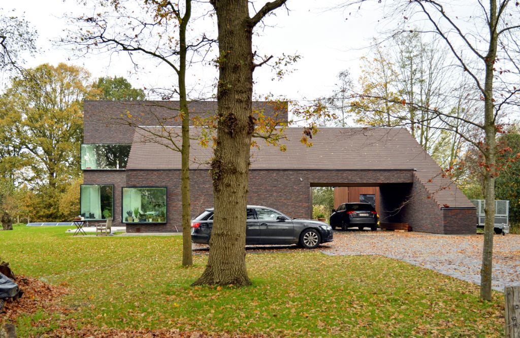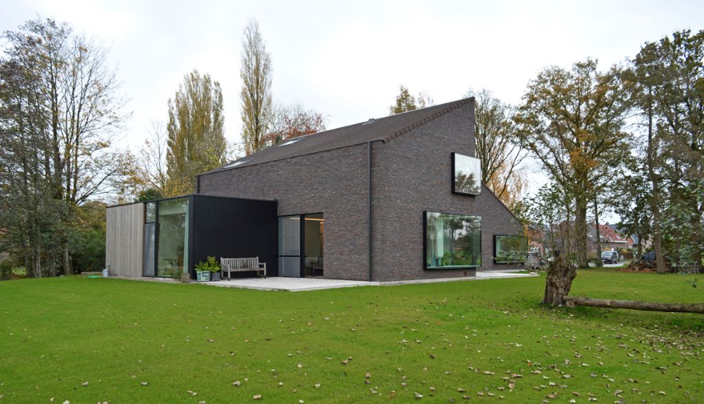 Architectuurbureau Dirk Hulpia ontwierp een woning voor een koppel en hun gasten te midden van een indrukwekkende groene omgeving. Het huis valt op door twee grote, hellende volumes die in sterk contrast staan met het vlakke terrein rondom, maar opwegen tegen de hoge bomen. Deze elementen worden verbonden door een lager volume met plat dak. De gebruikte materialen baksteen, leien, aluminium en hout, zijn zo gekozen dat het gebouw één geheel lijkt en een warme, uitnodigende uitstraling heeft. De grote ramen zijn ontworpen om aan de binnenkant een maximaal zicht op het landschap mogelijk te maken en om het huis aan de buitenkant een sterke identiteit te geven.