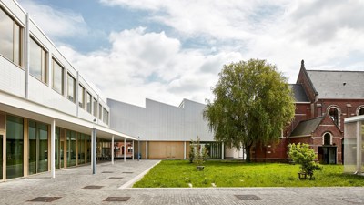 De publieke functies worden geclusterd rond de historische gebouwen. Een nieuw gebouwvolume sluit aan op het patrimonium en vormt er een geheel mee. De gebouwen omarmen een groen publiek binnengebied, dat wordt ingericht als ‘kapeltuin’, een plek die een zekere intimiteit en rust uitstraalt. De bibliotheek werd voorzien aan de kant van de Markt, de academie in de noordelijke vleugel. De cafetaria en een luifelconstructie vormen het bindend element tussen beiden. Sheddaken brengen noorderlicht in de nieuwe gebouwen.