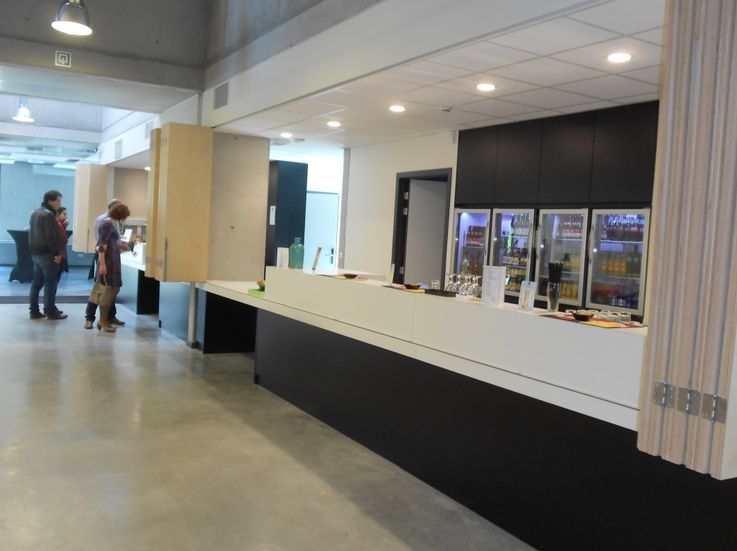 De inkomhal oogt ruim omwille van de vide die F.C.S. voorzag. Windmolders: “Op deze vide zijn we trots want het is een huzarenstukje om zoiets brandveilig te maken. Deze ruimte herbergt al het noodzakelijke faciliteiten op een zeer toegankelijke manier. Sanitair, drankautomaten en lockers bevinden zich tegenover de lange balie die volledig afgesloten kan worden door houten panelen.Toegankelijkheid voor mindervaliden loopt als een rode draad door ons ontwerp. Dat toont zich in de geautomatiseerde deuren, de sprekende lift en ruime doorgangen, maar evenzeer in details als de inkepingen in de balie voor rolstoelgebruikers, ribbels op trappen en afgewerkte deurklinken. Het gebouw is bekroond met het A+ label, het toegankelijkheidslabel van toerisme Vlaanderen.”
