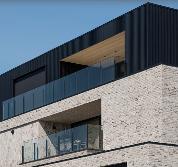 De horizontale balkvormen in het ontwerp zijn niet alleen constructief en functioneel, maar ook esthetisch gedefinieerd. De uitsnijdingen in deze volumes zijn uitgewerkt met dieper gelegen metselwerk en raampartijen, waardoor een spel van licht, schaduw en textuur ontstaat. Zwarte natuursteen accenten markeren deze uitsnijdingen en versterken het grafische karakter van het ontwerp. Het bovenste volume, uitgevoerd in zwarte geprofileerde platen, onderscheidt zich duidelijk als het dakvolume, waarmee het klassieke beeld van “gebouw en dak” in een hedendaags jasje wordt gestoken.