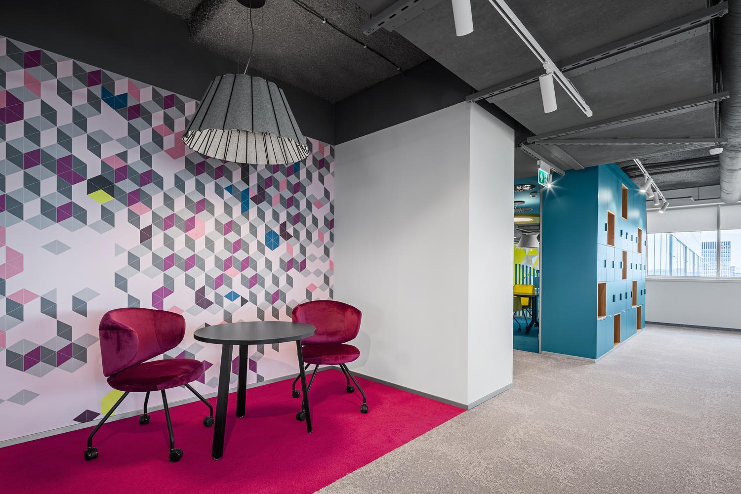 De heldere en kleurrijke vloeren, in combinatie met grafische en geometrische patronen, geven het interieur karakter en panache. Na maanden van telewerk wilde de bank haar medewerkers opnieuw verwelkomen in een vriendelijke en dynamische kantoorruimte en was vooral het creëren van zo'n levendige sfeer belangrijk.