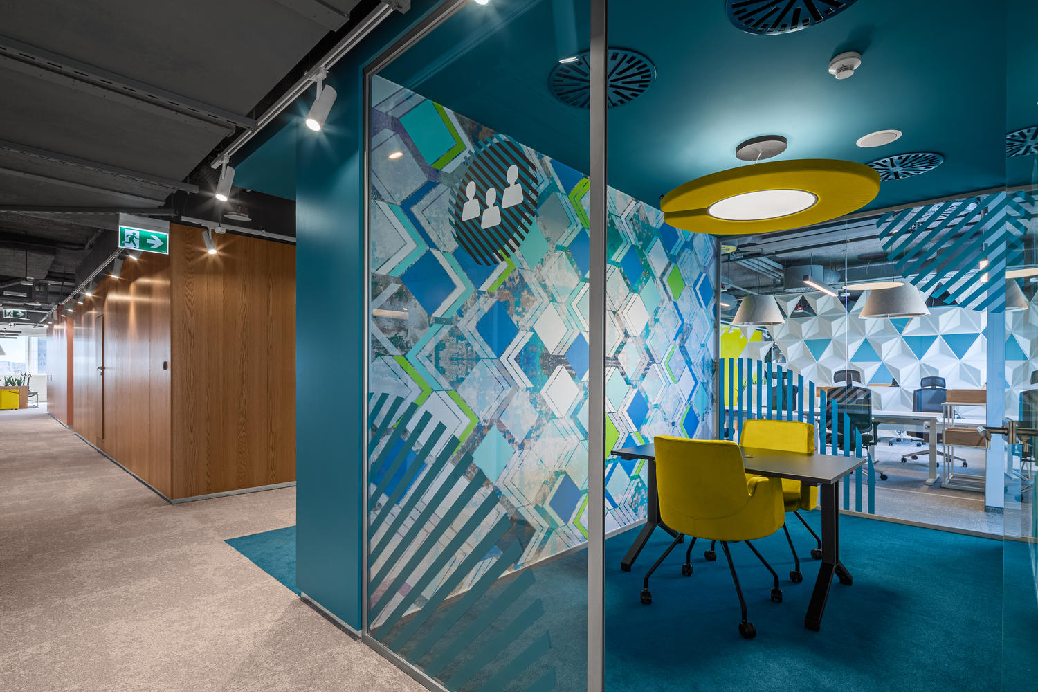 De studio besloot een unieke maar vrolijke ruimte te creëren met een gedurfd en energiek kleurenpalet. Zij hebben een variatie aan ruimtelijke en grafische vormen gebruikt, evenals een eclectische mix van meubilair en decoratieve objecten, om een geheel nieuwe look te creëren in het kantoor.