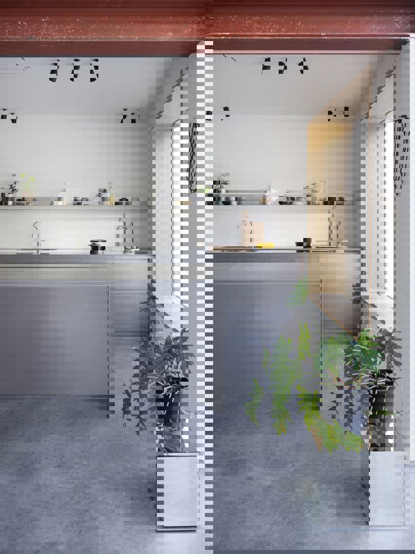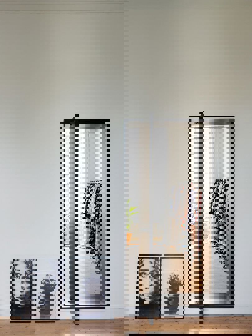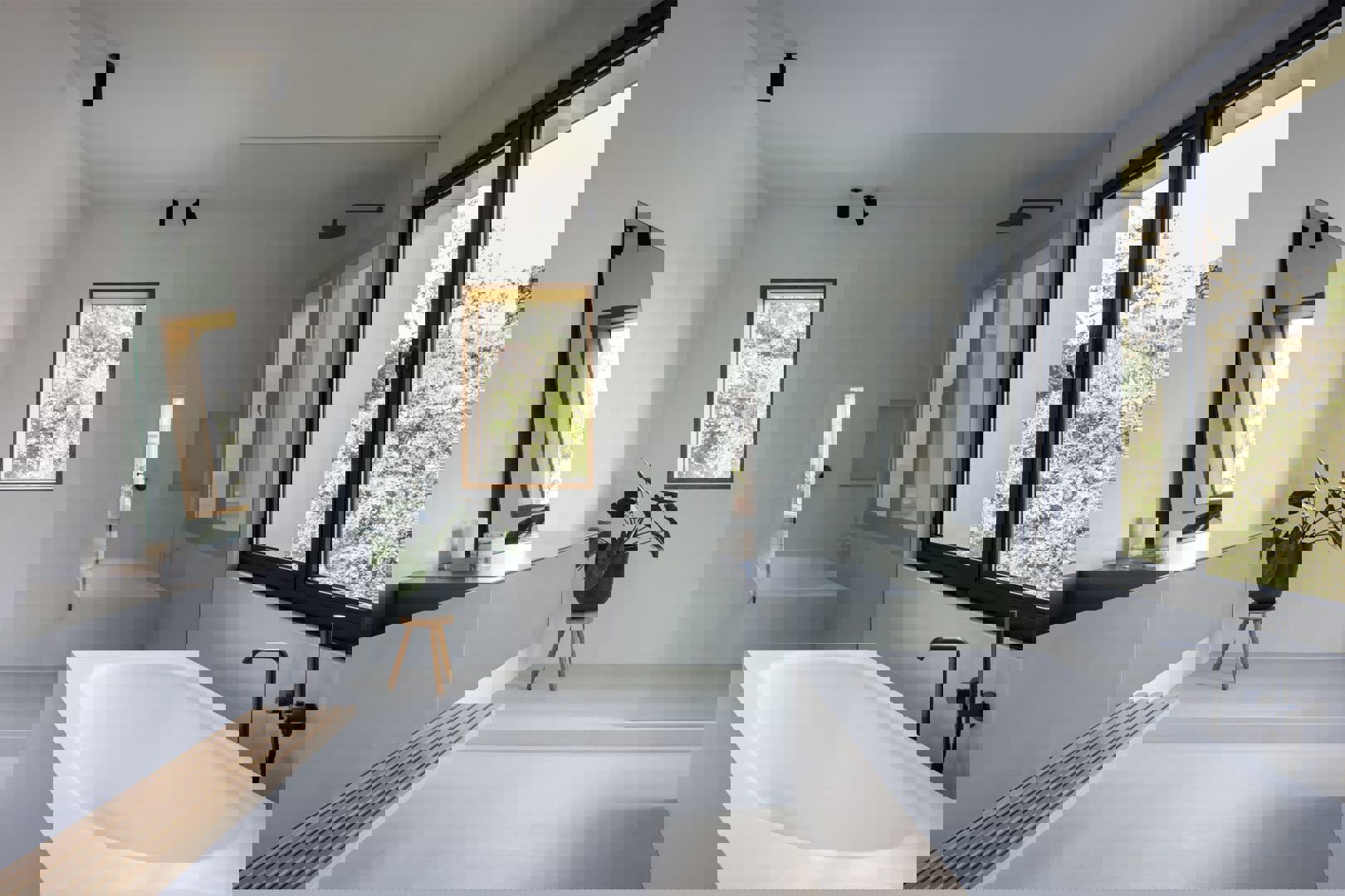 Een van de blikvangers is de nieuwe keuken met grote pivotramen die een onbelemmerd zicht bieden op de tuin. De grens tussen binnen en buiten vervaagt, terwijl frisse lucht en daglicht het interieur verlevendigen. De spiegelende aluminiumplaten op de achtergevel creëren bovendien een intrigerende illusie: de tuin lijkt groter, groener en zonniger dan hij is. Zo wordt het buitengevoel letterlijk weerspiegeld in het binnenleven – een subtiele ingreep met grote ruimtelijke en atmosferische impact.