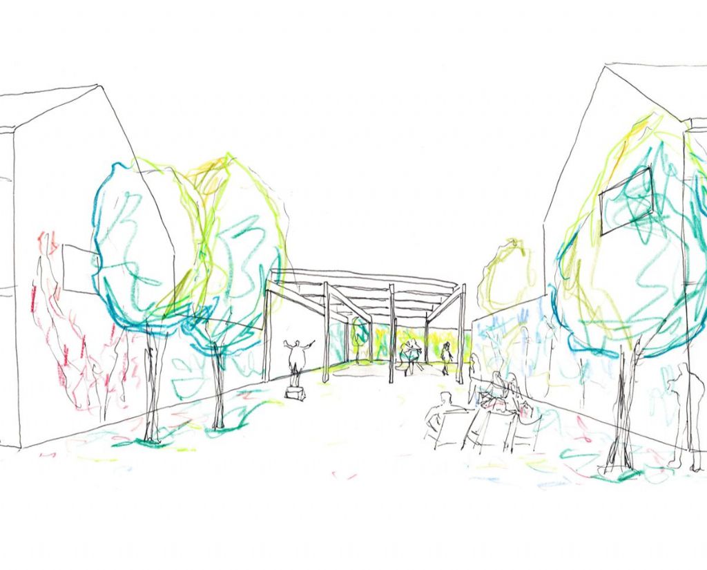 Via beide toegangen kunnen buurtbewoners wandelen naar de zonnige binnentuin tussen de loods en de luifel. Daar ontmoeten ze elkaar in een groene oase. Zitplekken worden afgewisseld met plantenbedden. Door ‘eigen kweek’ te vermengen met bloeiende en geurende planten, wordt het een ‘lusttuin’ voor mens, flora en fauna. Ook allerhande spelprikkels vinden een plek in het park: moestuinen, schommels, podium, waterspeelplek en pluktuinen.