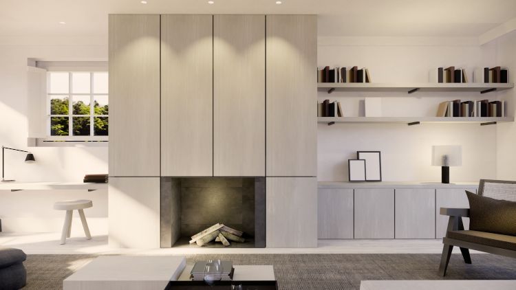 “De eerste ontmoeting met Vandebroek vond plaats bij ons thuis. Samen met hun calculator en onze interieurarchitect overliepen we de plannen meteen in detail. Centraal in het ontwerp stond het wandmeubel in lichte eiken fineer. Met enerzijds een ingewerkte televisie die we kunnen verbergen achter twee greeploze deuren. Anderzijds een volledig nieuw haardvuur en een combinatie van langwerpige schappen en kleinere opbergkastjes.”
