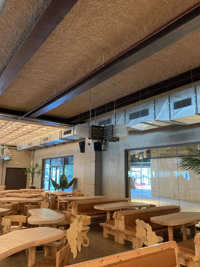 De ruimteakoestiek in het atrium bracht extra uitdagingen met zich mee. De invulling van de betoncassettes in het plafond werd herwerkt, aangevuld met akoestische wandafwerkingen. Zo ontstond een beheersbare geluidsomgeving, ondanks de openheid en visuele impact van deze ruimte. De grenzen tussen de levendige foodmarket en stillere aanpalende zones werden zorgvuldig bewaakt, met het oog op rust en concentratie.