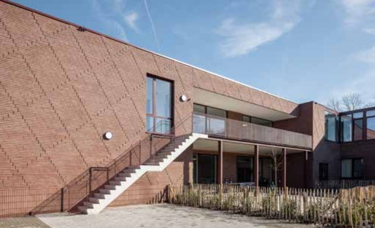 De uniforme, warme kleur van gevelsteen, aluminium bekleding en buitenschrijnwerk versterkt die samenhang. Tegelijk zorgt de subtiele variatie in het metselwerk ervoor dat de gevel nooit monotoon wordt. In combinatie met de groene buitenaanleg ontstaat een architectuur die zich rustig maar karaktervol in haar omgeving positioneert.