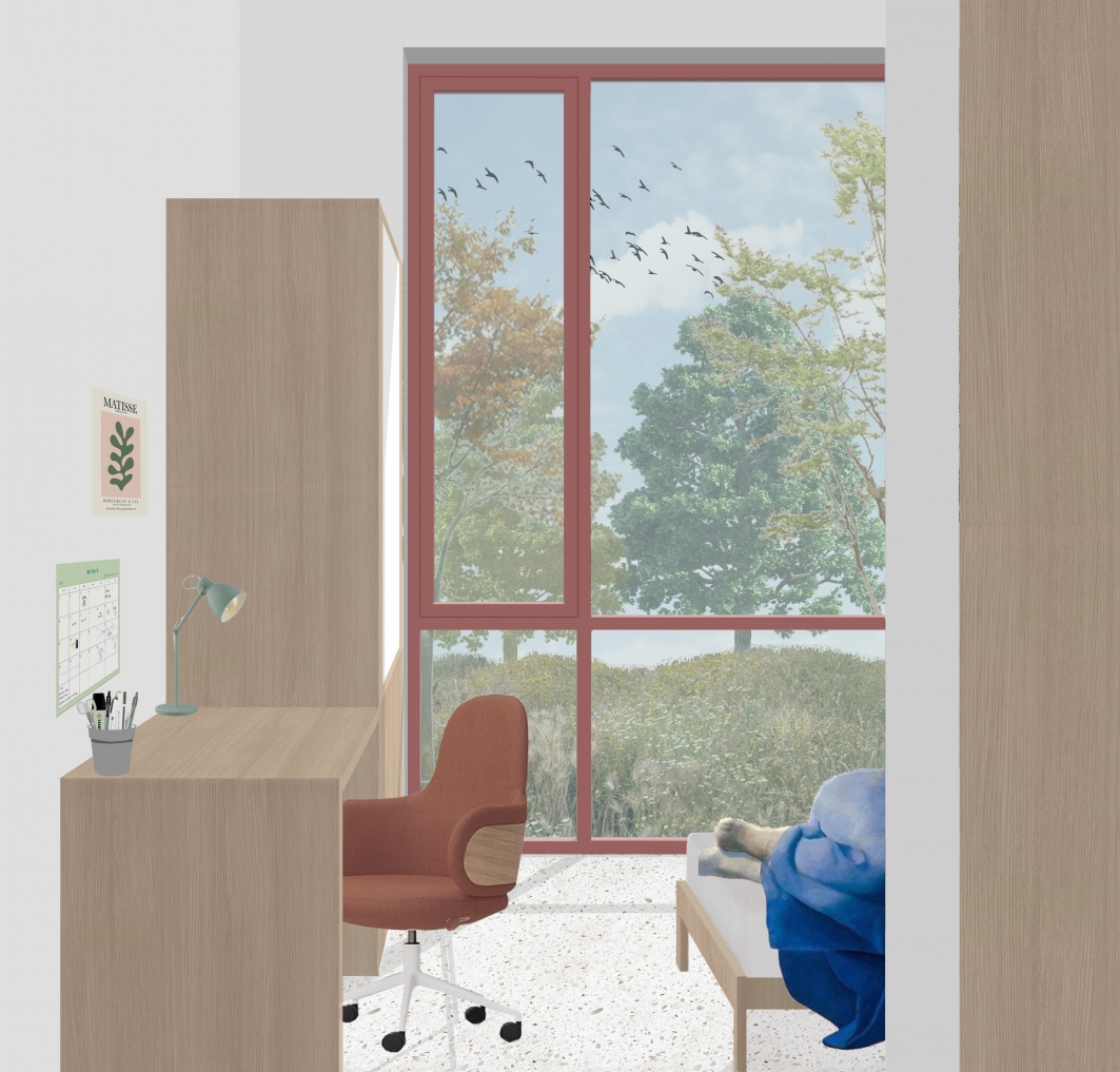 Binnenin vertaalt diezelfde logica zich in een zorgvuldige organisatie van de leefgroepen. De centrale leefruimte met open keuken vormt het hart van elke eenheid. Daaromheen worden de kamers in kleine clusters gegroepeerd, waardoor lange, anonieme gangen worden vermeden. In plaats daarvan ontstaan korte circulaties met zicht op groen en overvloedig daglicht.