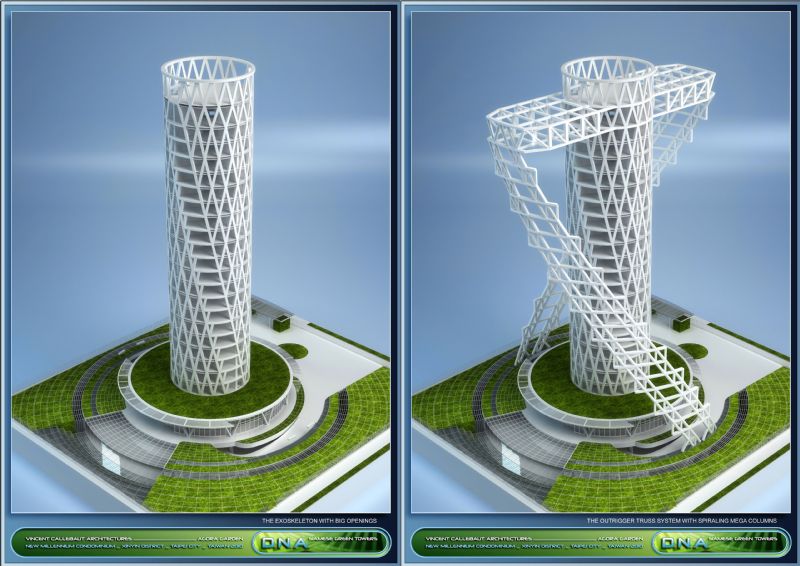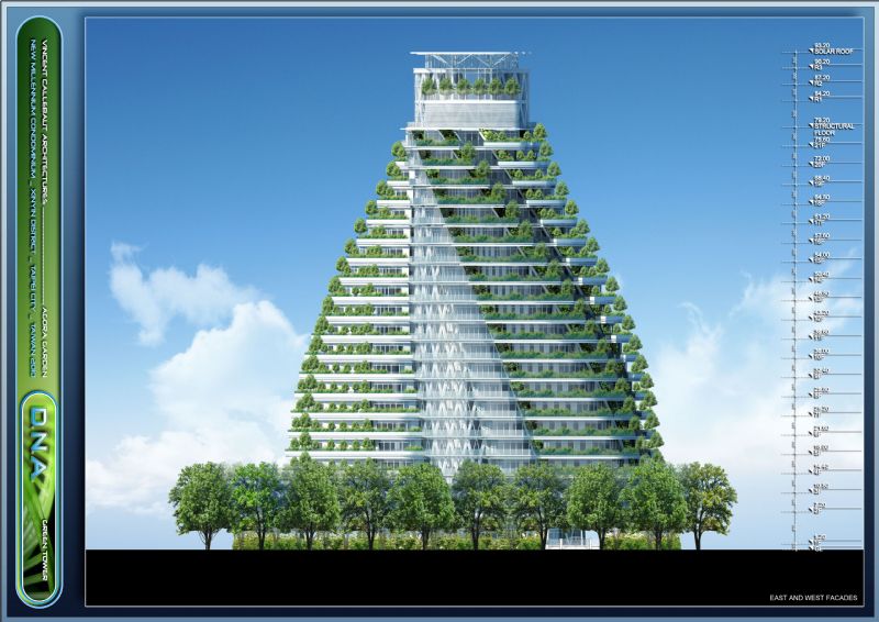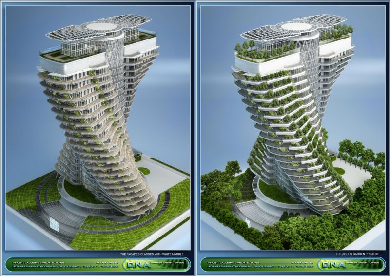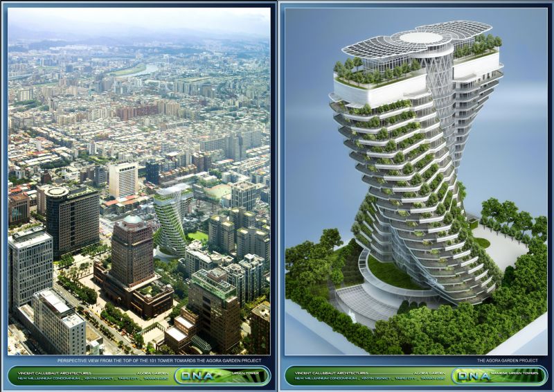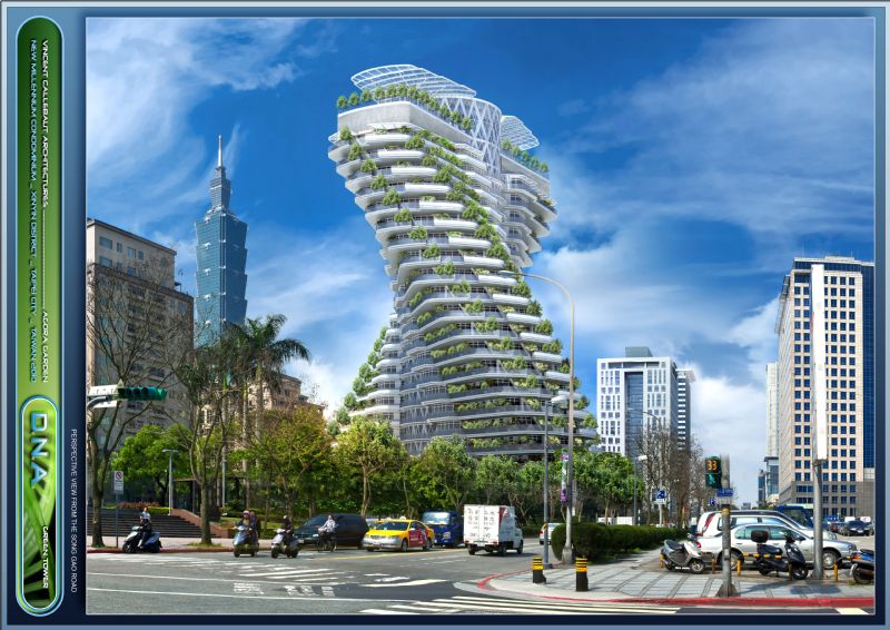 Taipei, Taiwan krijgt een bijzonder groen gebouw. De wolkenkrabber toont zich uniek in de stad met zijn natuurlijke uitstraling. Een rondomlopende rij van bomen vormt zich naar het menselijke DNA. Vincent Callebout Architectures won in 2010 de ontwerpwedstrijd. De honderd meter hoge toren biedt ruime flats voor de welgestelden onder ons.