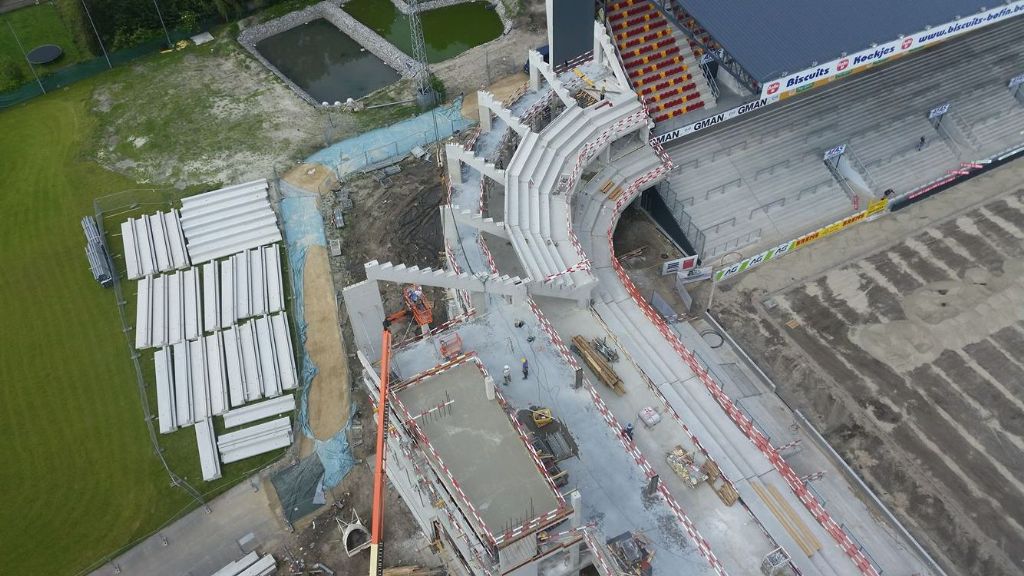 BETON: Naar deze renovatie keek elke supporter al lang uit. Het stadion zal uiteindelijk helemaal vernieuwd worden, maar voorlopig zijn twee zijden van de tribunes nieuw, met grote delen in prefab beton.