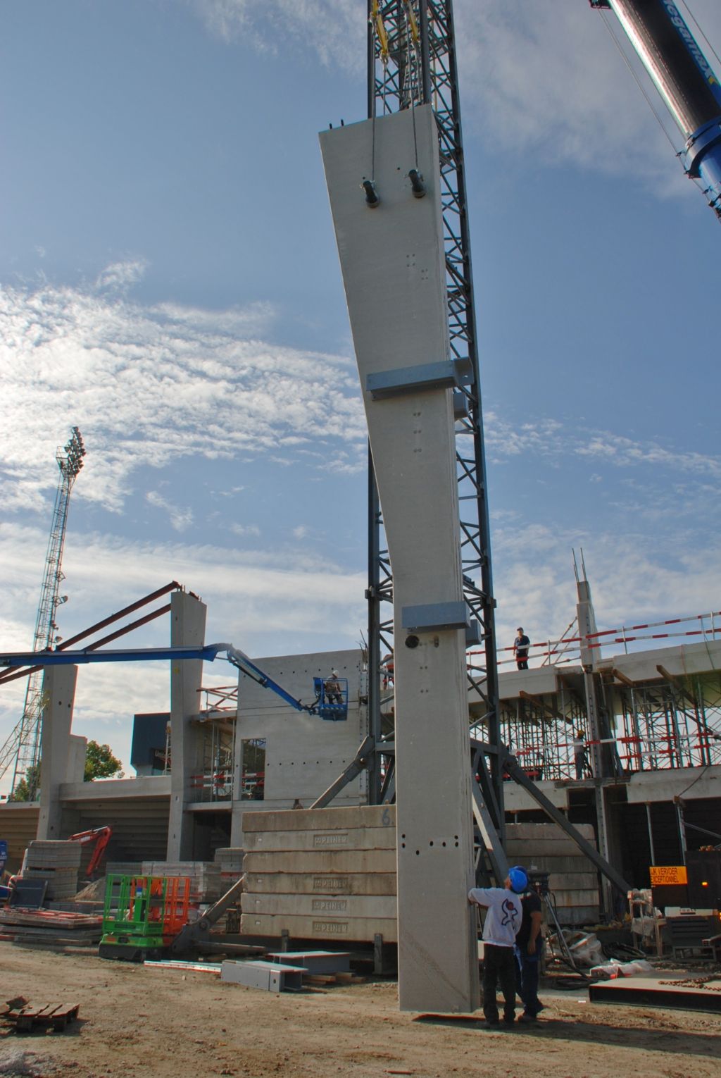 Van Campenhout: “In het bouwteam waarin we werkten, hebben onze praktische opmerkingen geleid tot aanpassingen in het ontwerp die de uitvoerbaarheid ten goede kwamen. Dat zie je bijvoorbeeld aan de kolommen die het stadion langs de buitenzijde kenmerken. Die waren oorspronkelijk 29 meter lang. Productie-gewijs zou dat geen probleem geven maar het transport van de 75-ton zware elementen zou nooit via de bebouwde kom en de Kleine Nieuwendijkstraat op de werf geraken. Het werd dus al snel duidelijk dat de wens van de aannemer om de kolom van fundering tot nok in een stuk te maken, niet realistisch was.”