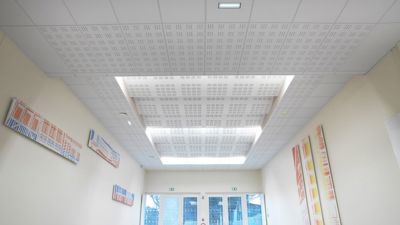 Om het akoestische comfort van lawaaierige ruimtes gemakkelijk en duurzaam te verbeteren, heeft Knauf een geperforeerd wandpaneel uit gips (met Tangent perforaties) ontwikkeld. Het meet 2400 x 450 mm en heeft een wit gelamineerd oppervlak. De ADIT-gipsplaten bieden de ideale geluiddempende oplossing. Ze staan garant voor een hoge geluidsabsorptie (aw: 0,90) en een aanzienlijke verbetering van de nagalmtijd. Het uitgesproken onderhoudsgemak van het gelamineerde oppervlak is een bijkomende troef.