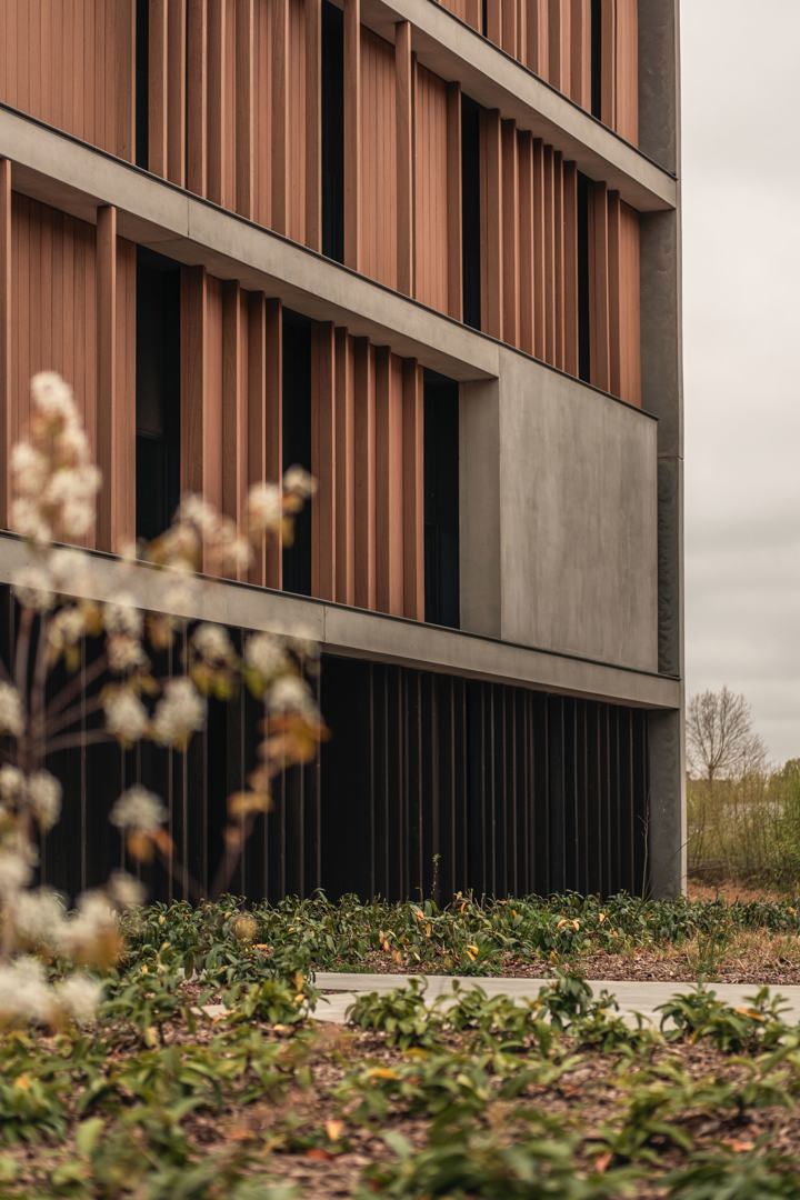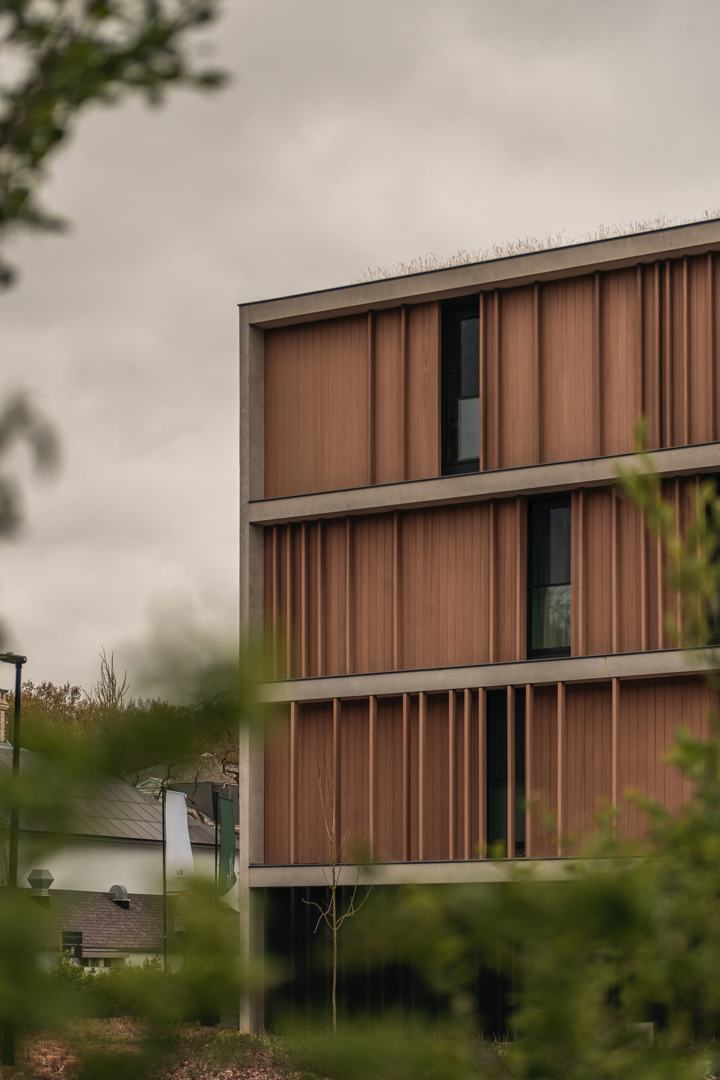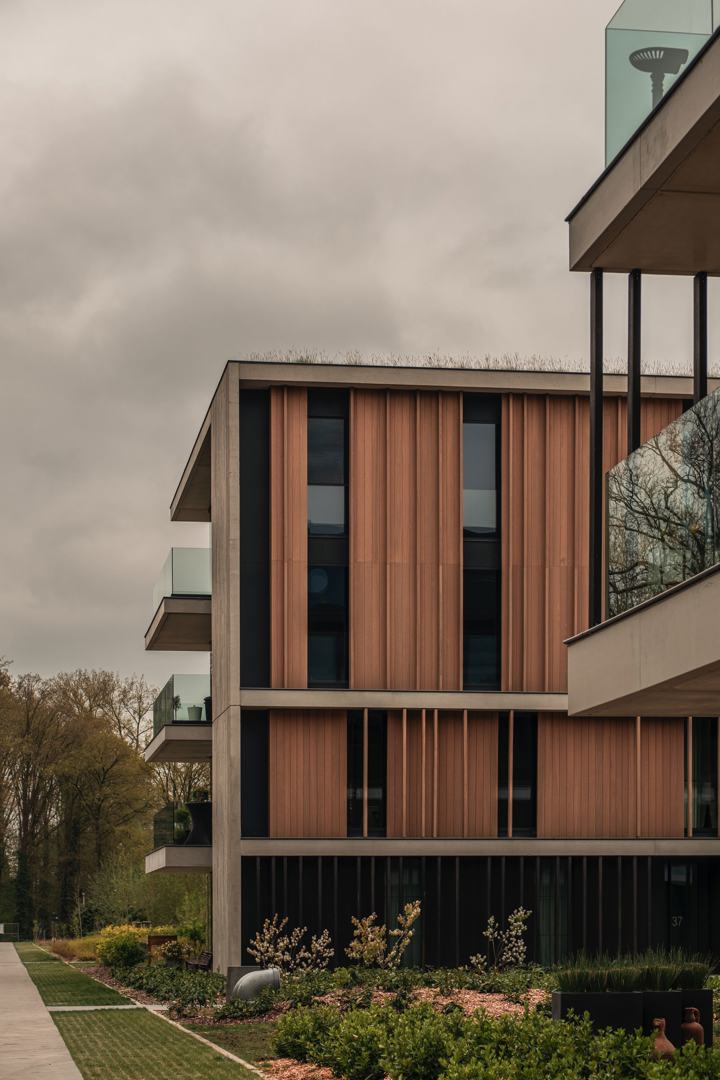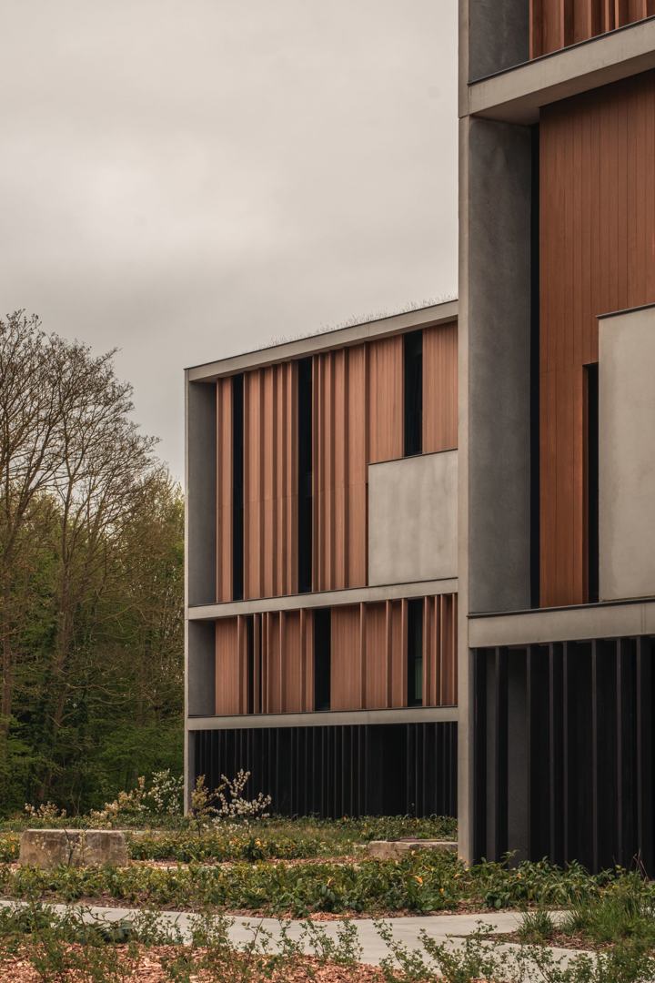 De warme, aardse tinten van Abechi geven de volumes een eigen identiteit, terwijl de structuur en detaillering van de gevelbekleding de verfijning van de architectuur versterken. Waar houten gevelbekleding niet mogelijk was, met name de hoogste bouwdelen, werd het hout consequent doorgetrokken in de terrassen.