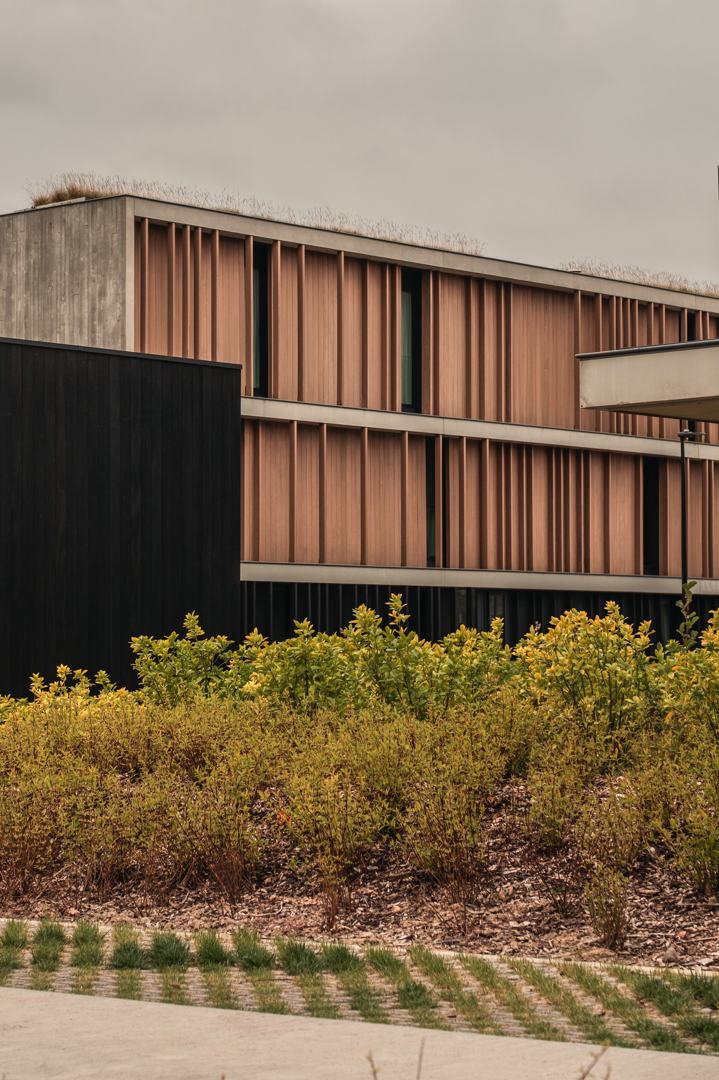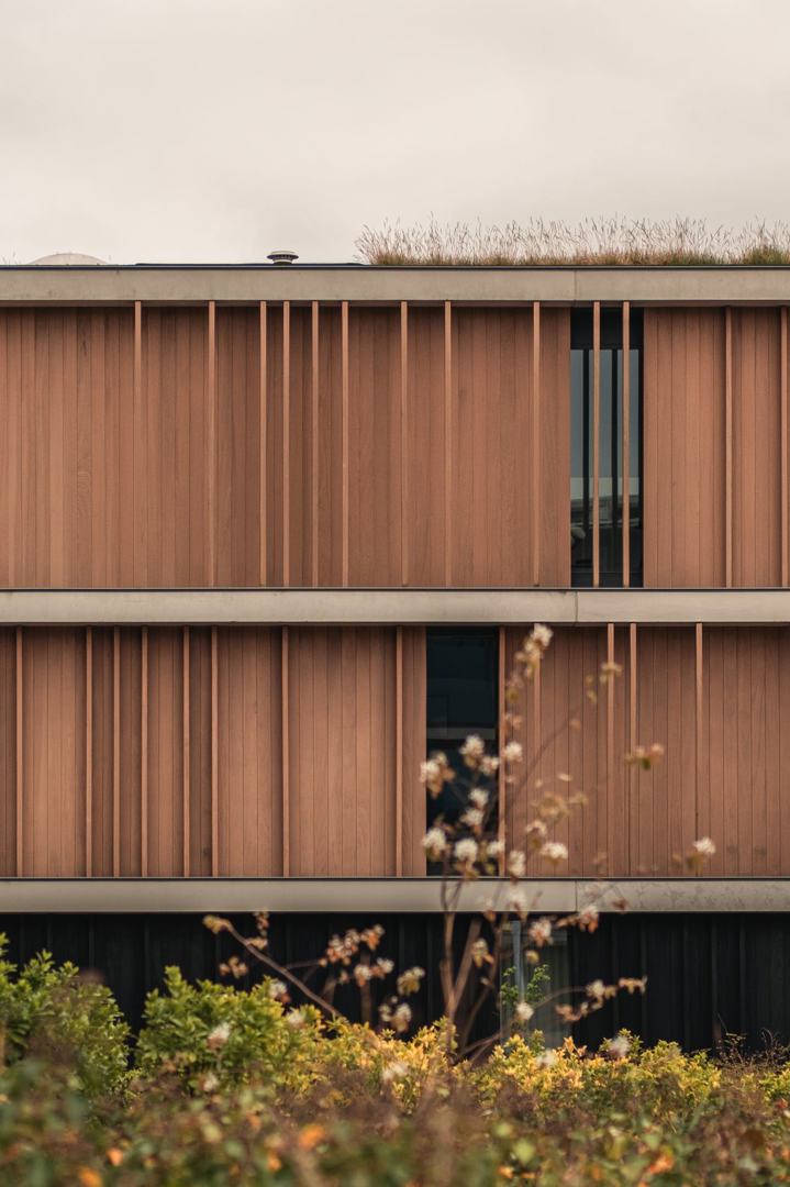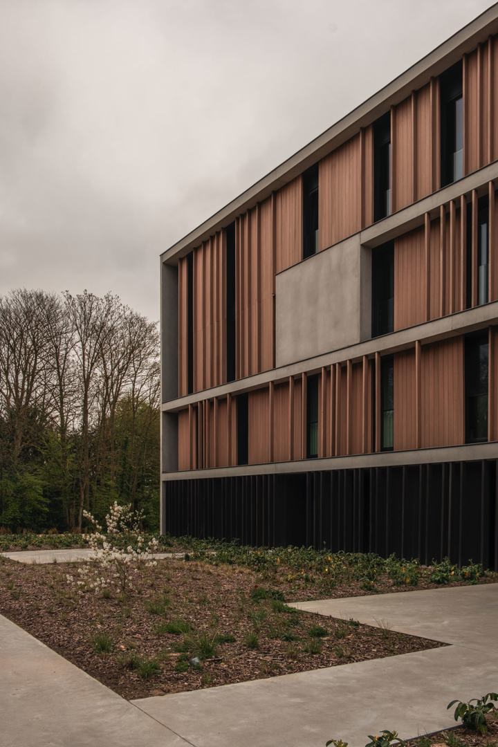 Govaert & Vanhoutte Architects koos voor de uitvoering Abechi – de Fassade-collectie is beschikbaar in drie verschillende houtsoorten, elk met hun eigen karakter en kleurschakering: abechi, pina en limba – in het profiel Plato en met de kleur Beaver, aangevuld met verticale lamellen. In totaal gaat het om 2.126 m² aan gevelbekleding.