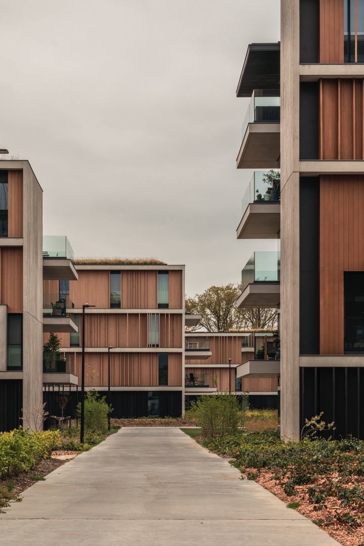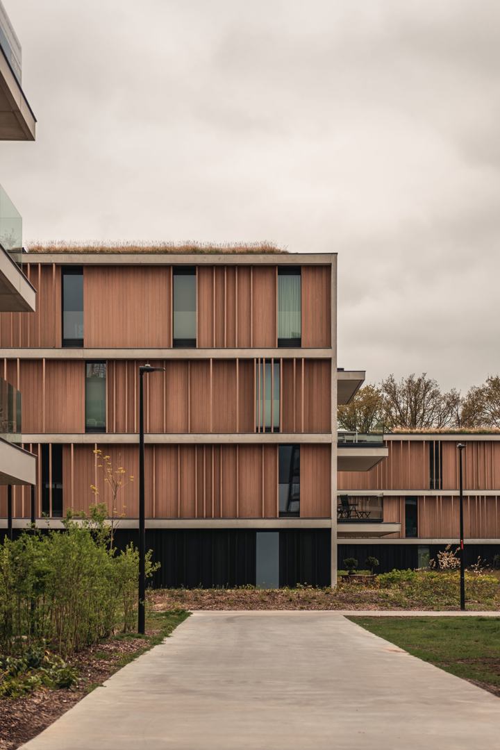 Verfijnde lijnen, een zekere ritmiek en een hoge graad van detaillering, het handelsmerk van Govaert & Vanhoutte Architects, kenmerken de zeven woonblokken. De keuze van het architectenbureau voor gevelbekleding uit de Fassade-collectie van Woodstoxx draagt daar in hoge mate aan bij.
