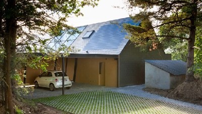 De hoeve staat op een zwevend dek. Aan de zuidkant bevindt zich een terras dat door een met vezelcementplaten beklede carport van de straatkant afgeschermd wordt. De gevels zijn bekleed met zwarte Borondaleien van het bedrijf Eternit. De leien zijn fotovoltaïsch en door de sterke afwerkingslaag kunnen water en vuil gemakkelijk afglijden. Volgens de architect transformeren de donkere leien de hoeve tot ‘een schaduw van zichzelf’. Dat lijkt een bescheiden doelstelling voor een architect, maar het was wegens stedenbouwkundige redenen noodzakelijk dat de hoeve beter bij het landschap paste. Je kan namelijk niet zomaar in zo'n mooie omgeving wonen. Maar opdat de bewoners beter van dat landschap kunnen genieten, heeft men de woning aan de binnenkant onder 9 graden gedraaid.