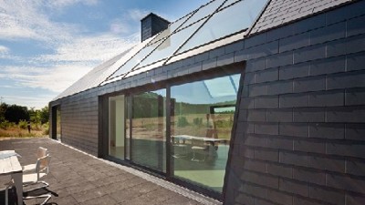 Onopvallend opvallend, zo zou je de vernieuwde hoeve in Schaffen bij Diest kunnen noemen. Dat is te danken aan BXL-architecten, maar ook aan de zwarte fotovoltaïsche leien, waarmee de gevel bekleed is.