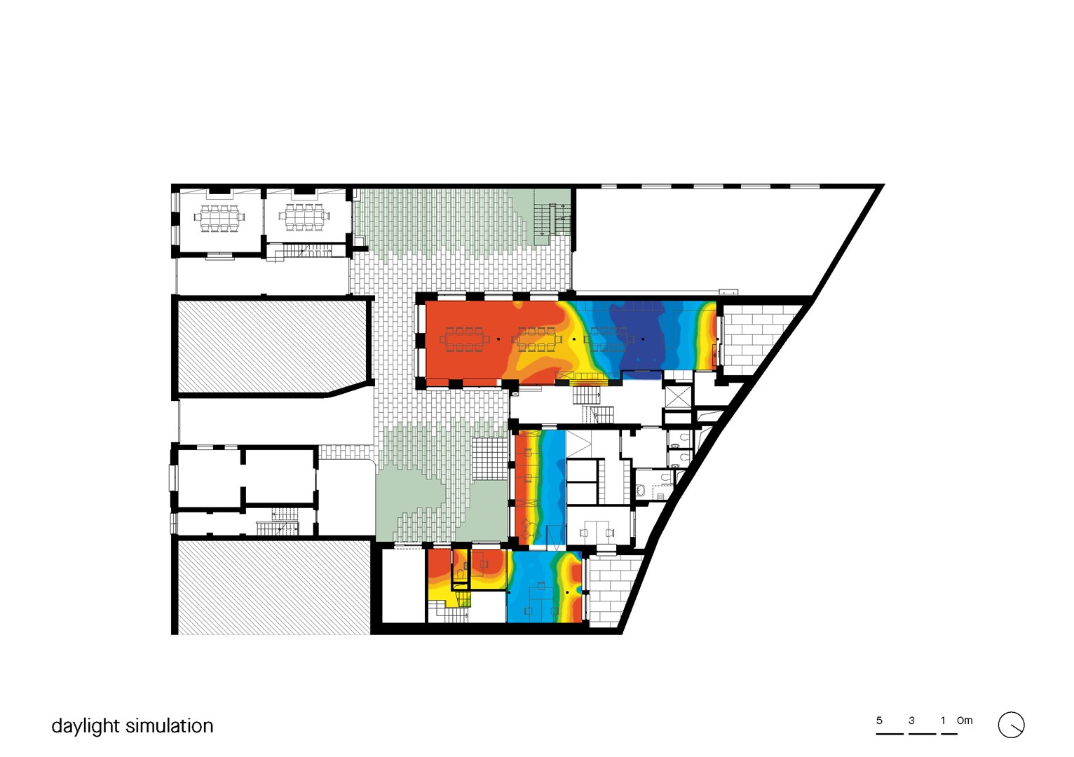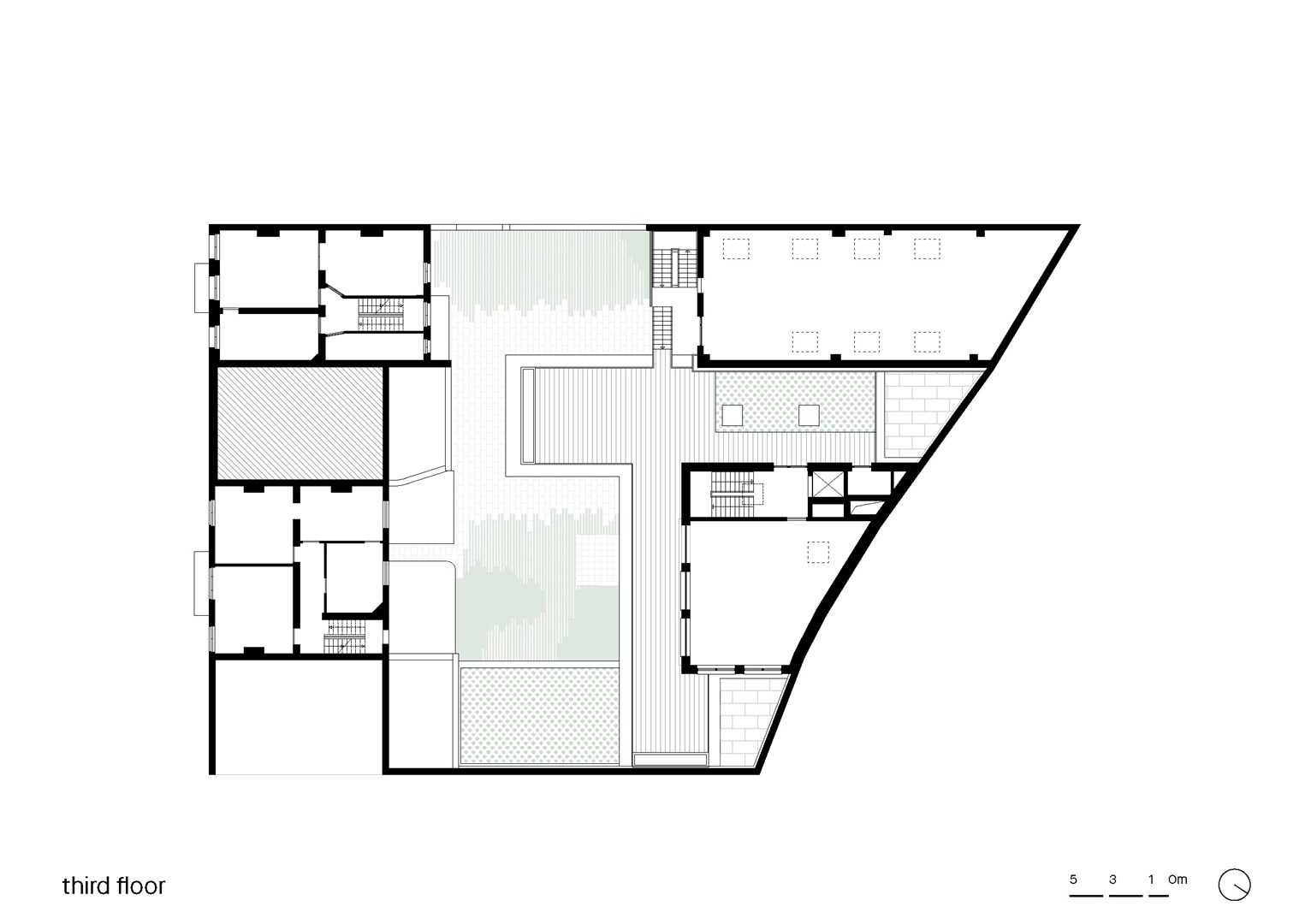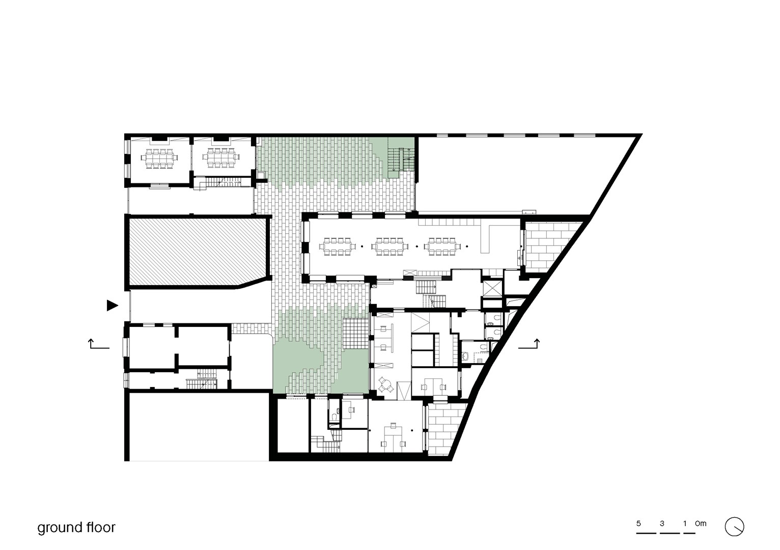 Centraal in de renovatie stond het principe van ‘sufficiëntie’, waarbij eerst werd gekeken naar wat al beschikbaar was in termen van structuren en energie. In plaats van te slopen en opnieuw op te bouwen, koos archipelago ervoor om bestaande elementen maximaal te benutten en slechts ‘net genoeg’ toe te voegen voor de specifieke noden van Greenpeace. Zo blijft de ecologische voetafdruk beperkt, terwijl de historische identiteit van het gebouw behouden blijft.