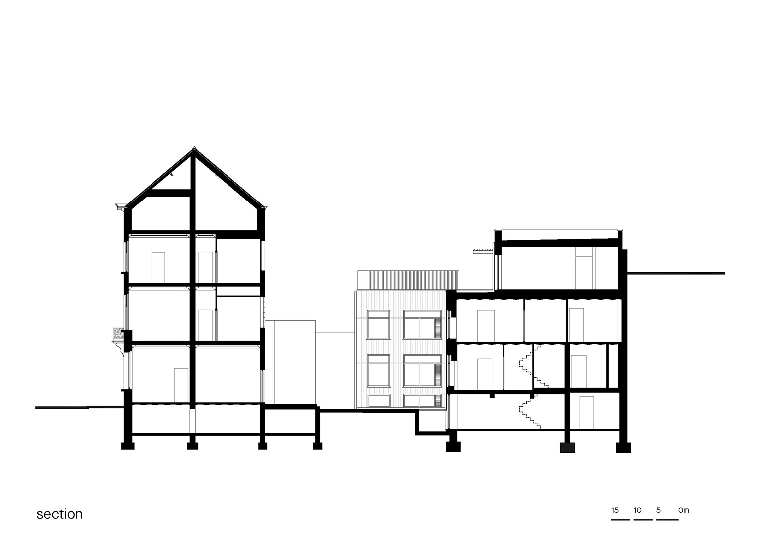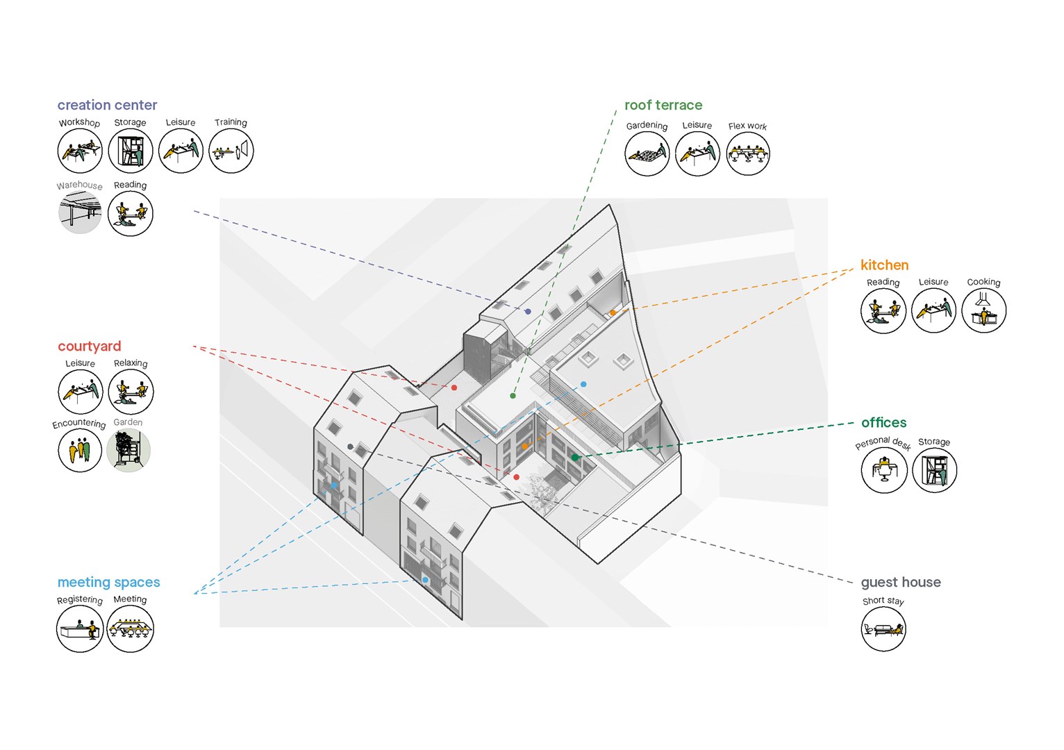 Het gebouw is georganiseerd als een opeenvolging van binnen- en buitenruimtes, publieke en private zones, en diverse binnenklimaten. Zo is het voormalige orgelatelier nu een werkplaats voor Greenpeace-activisten, terwijl de voorste rijhuizen gastenkamers huisvesten. Tussen deze zones in liggen overgangen die natuurlijke lichtinval, ventilatie en interactie maximaliseren. Dit flexibele ontwerp weerspiegelt de dynamische en steeds veranderende werking van Greenpeace.