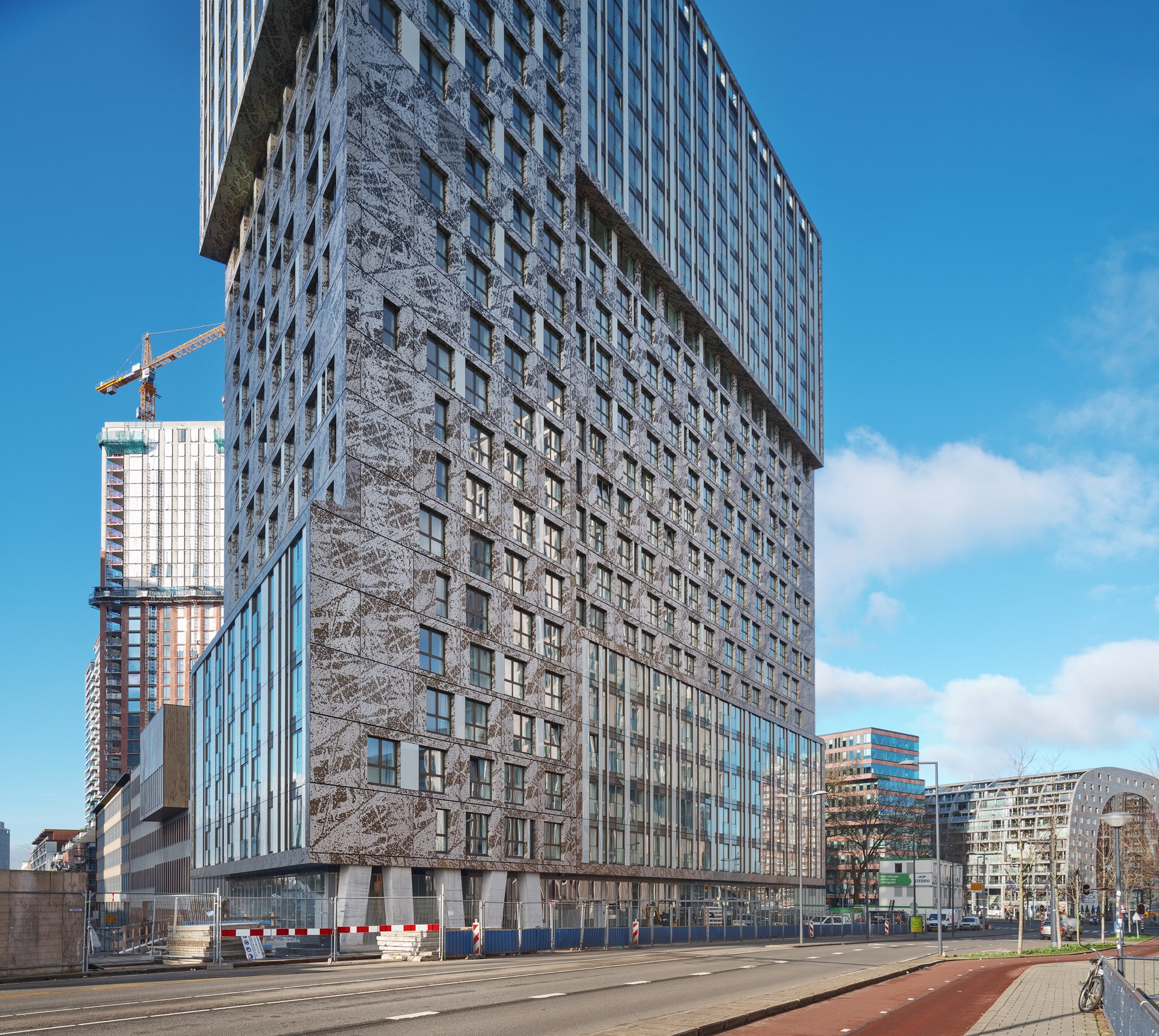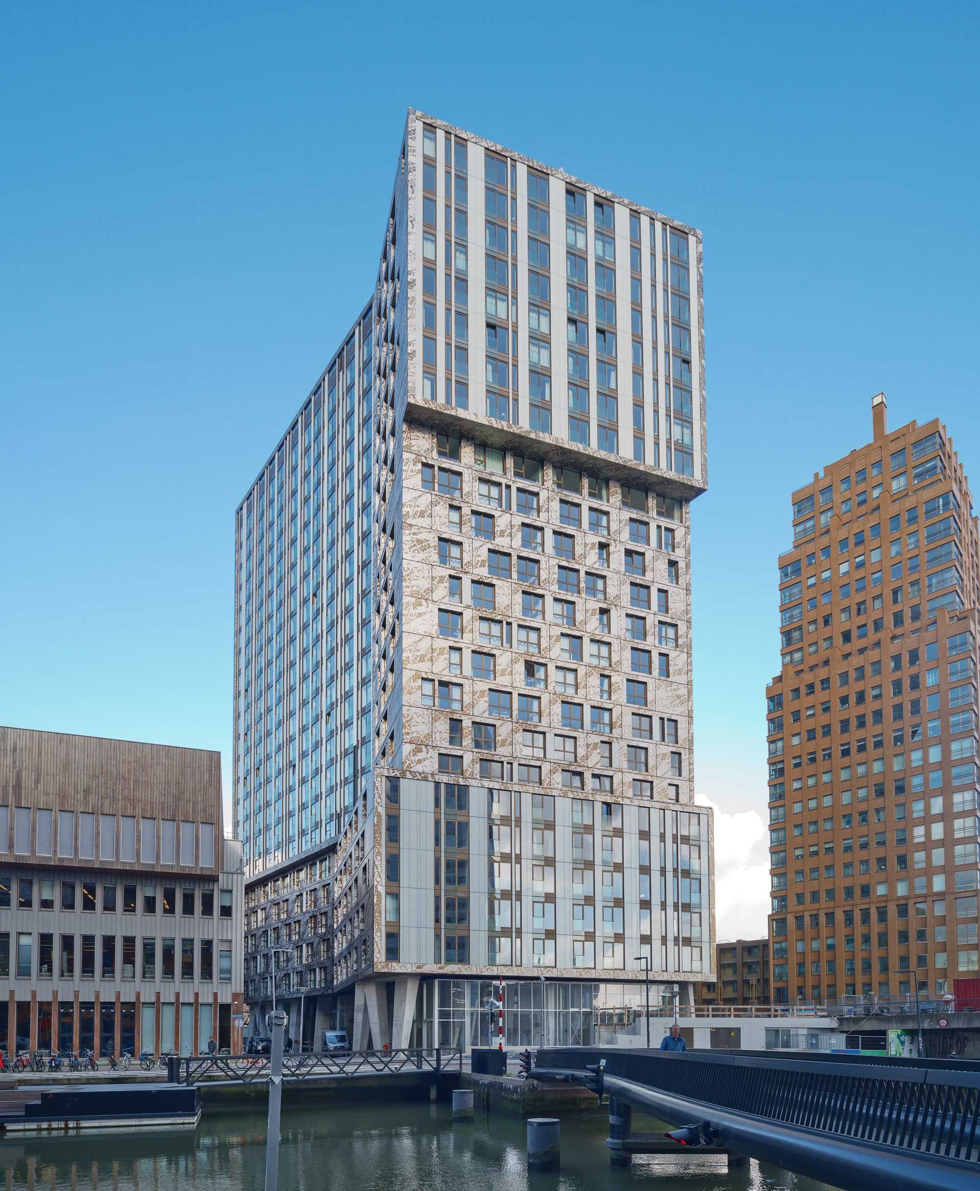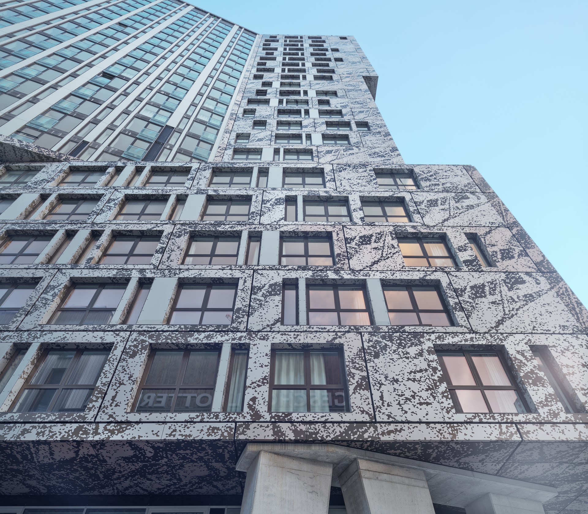 Het gebouw en de kade zijn met elkaar verbonden, net als de kade en de brug. De vroegere leemte is niet alleen opgevuld, maar er zijn ook nieuwe relaties binnen de stedelijke context gegenereerd, waarbij de herinneringen aan puin en bomschade alleen tot het verleden behoren. Dit is vooral te danken aan de gevel: deze is ontworpen in verschillende hoogten en met een ander design aan elke kant: een glazen gevel hier; een geventileerde ALUCOBOND® bedhaak-paneelgevel met gestanste ramen daar. De verschillende gevels benadrukken de aard van het gestapelde volume van het gebouw.