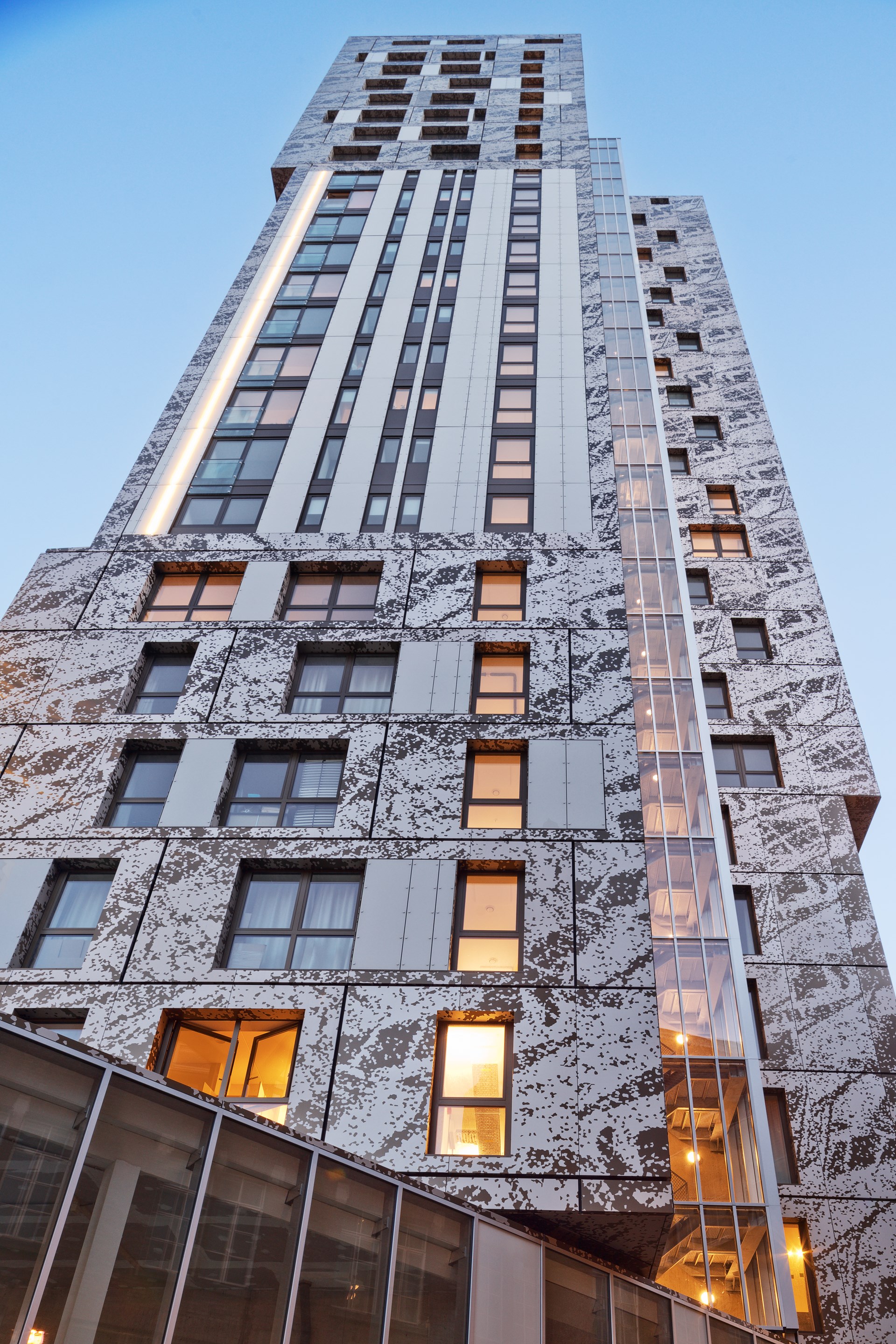 Dankzij dit concept konden ze de oppervlakte maximaliseren en ruimte creëren voor meer dan 600 appartementen op de bovenste verdiepingen. De benedenverdiepingen, waar zich een restaurant, winkels, kantoren en een bibliotheek bevinden, zijn open voor het publiek, zodat de architecten er niet alleen in slagen de ruimte optimaal te benutten, maar ook een verbinding met de omgeving tot stand brengen.