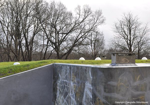 Het dak is bedekt met een halve meter grond en zand. Vandaar dat de tubes verlengd zijn met PVC-buizen. De stroken van PE-schuim rond de kokers isoleren de doorvoeren en EPDM-folie rond de gaten maakt het geheel waterdicht.