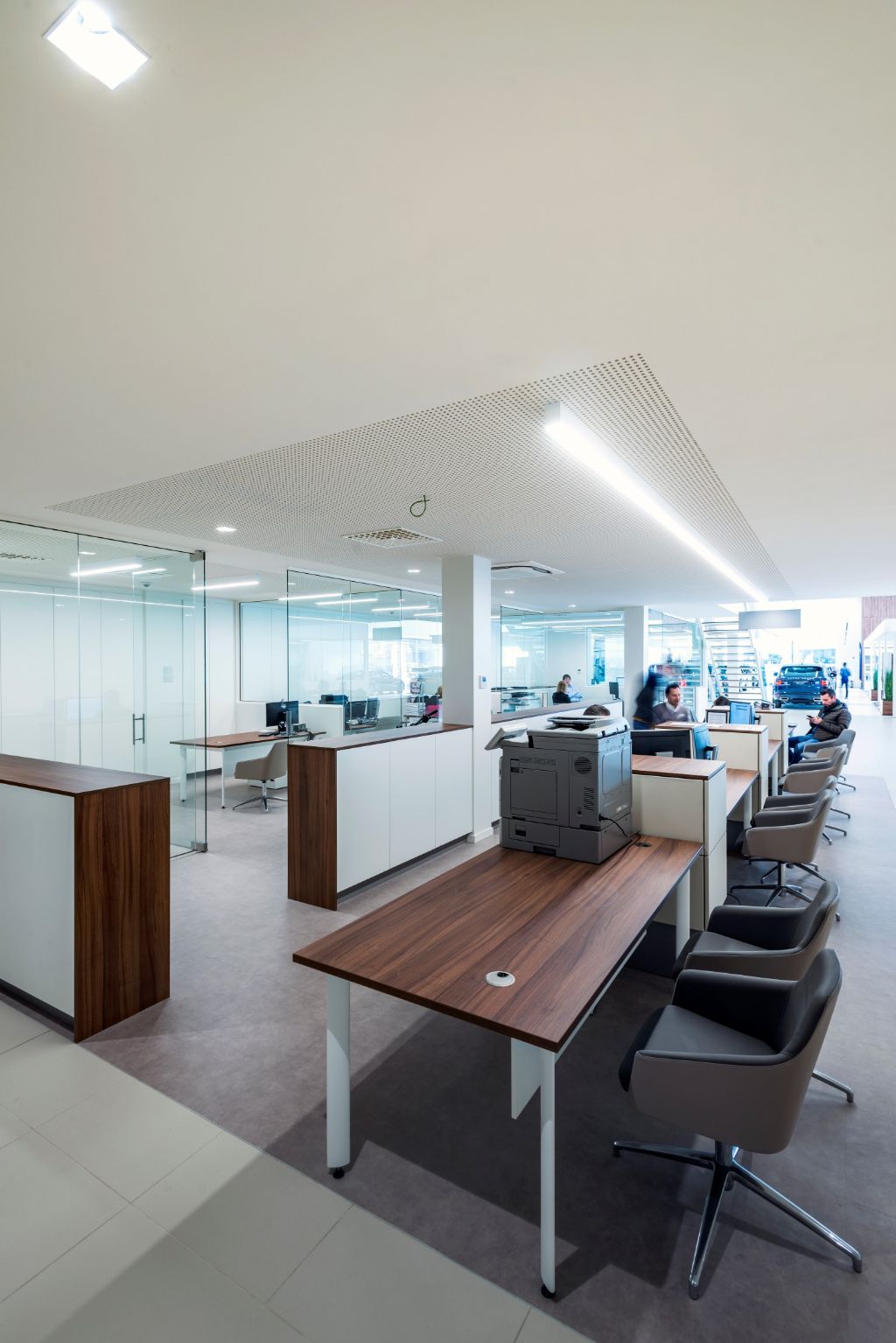 “Omdat Coventry Motors via zijn vestiging in Drogenbos nu al een tijd naast Jaguar en Landrover ook wagens van BMW, BMWi, MINI en Alpina verdeelt, was het noodzakelijk geworden het voorste, commerciële gedeelte van het gebouw opnieuw in te richten en showrooms te creëren volgens de identiteit van elk merk”, begint Thierry Martin van FCM Architects te vertellen. “Hoewel een showroom eigenlijk een industrieel gebouw is, moet de ruimte om evidente redenen toch hoogwaardig worden afgewerkt en daarom kozen we voor de binnenafwerking voor producten van Knauf. Het gaat hier immers om wat wij ‘droge montage’ noemen: gebouwen die snel gebouwd moeten worden, met een strakke deadline. Alles moet snel drogen zodat er snel kan worden geschilderd en de geringe droogtijd is, naast hun stevigheid, het grote voordeel van de plafond- en wandsystemen van Knauf.”