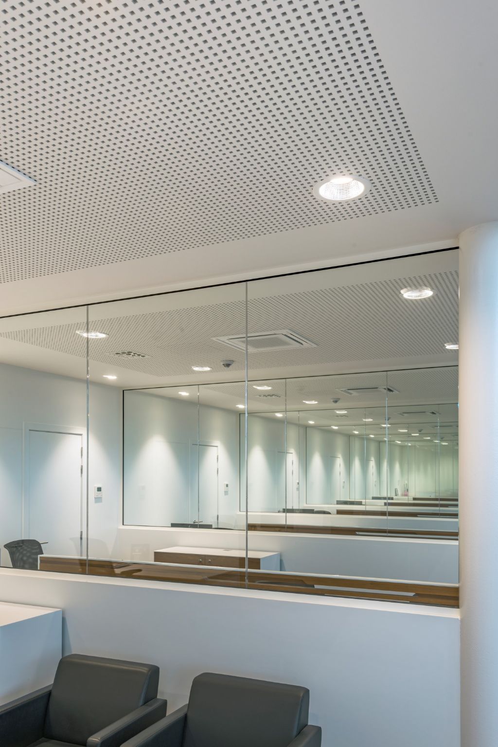 Maar uiteraard bieden de gebruikte producten niet enkel voordelen voor de droogbouwer. Zo voldoen de SoundDesign Claeneo-platen aan, hun naam zegt het zelf, alle eisen inzake akoestiek. Hun akoestische absorptie en regulering van de nagalmtijd maakt de nieuwe showroom tot een aangename werk- en ontvangstruimte. Bovendien dragen de platen mee bij aan een beter binnenklimaat en een betere luchtkwaliteit en krimpen of zwellen ze weinig tot niet bij verandering van de klimatologische omstandigheden. Met een brandstabiliteit van 30 minuten scoren de SoundDesign Claneo-platen ook goed op vlak van brandveiligheid. Die tijdspanne blijft ook bij het aanbrengen van doorboringen, lichtkoven, inspectieluiken of ventilatiekanalen gewaarborgd.
