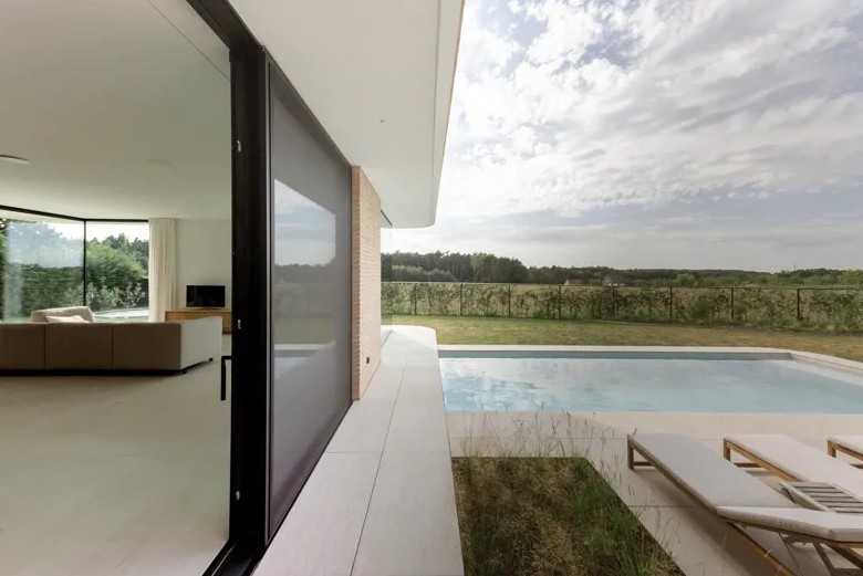 De bouwheer koos resoluut voor traditioneel bouwen, met grote glaspartijen, een gevel in baksteen en een doorgedreven detaillering. De keuze voor natuurlijke materialen geeft een warme uitstraling aan het hedendaagse ontwerp, terwijl de gelaagdheid van de volumes zich vertaalt in een uitgesproken horizontale architectuurtaal.