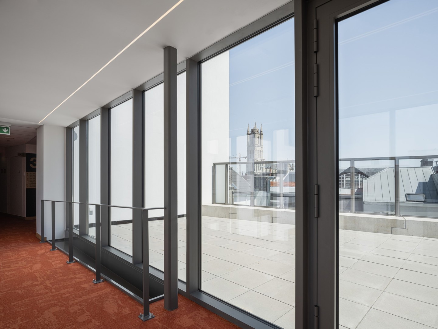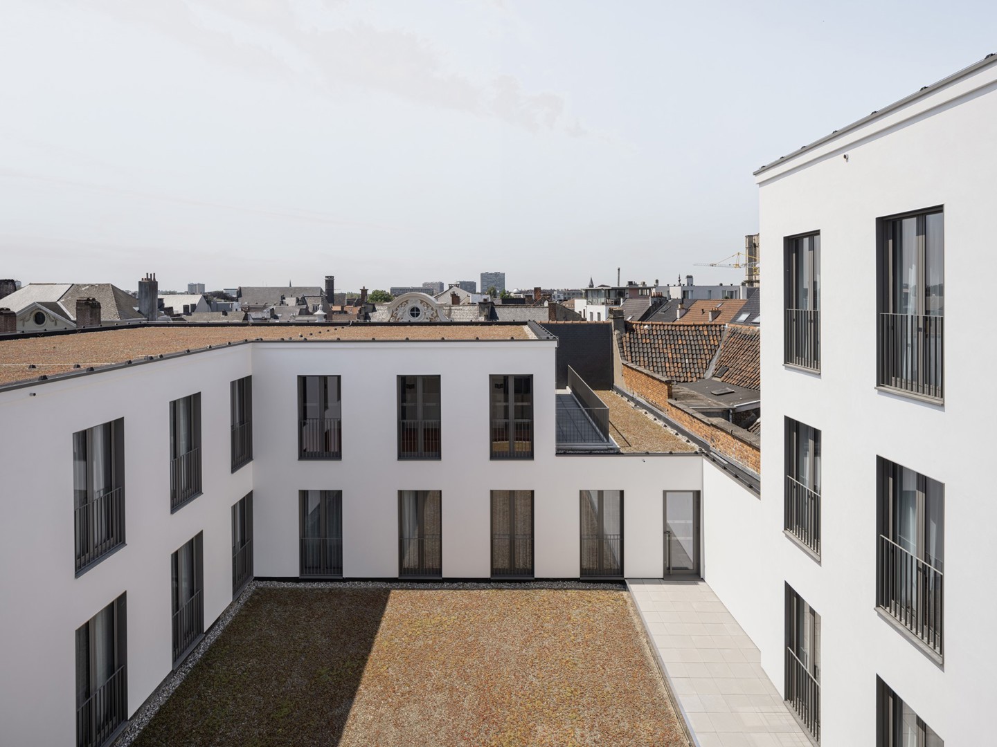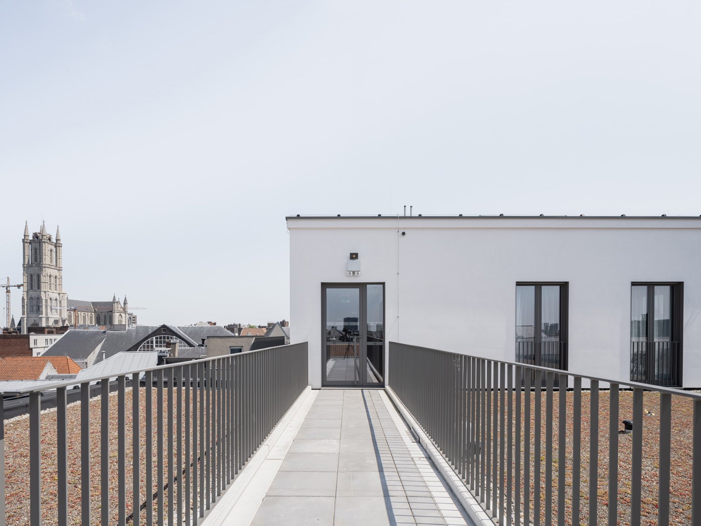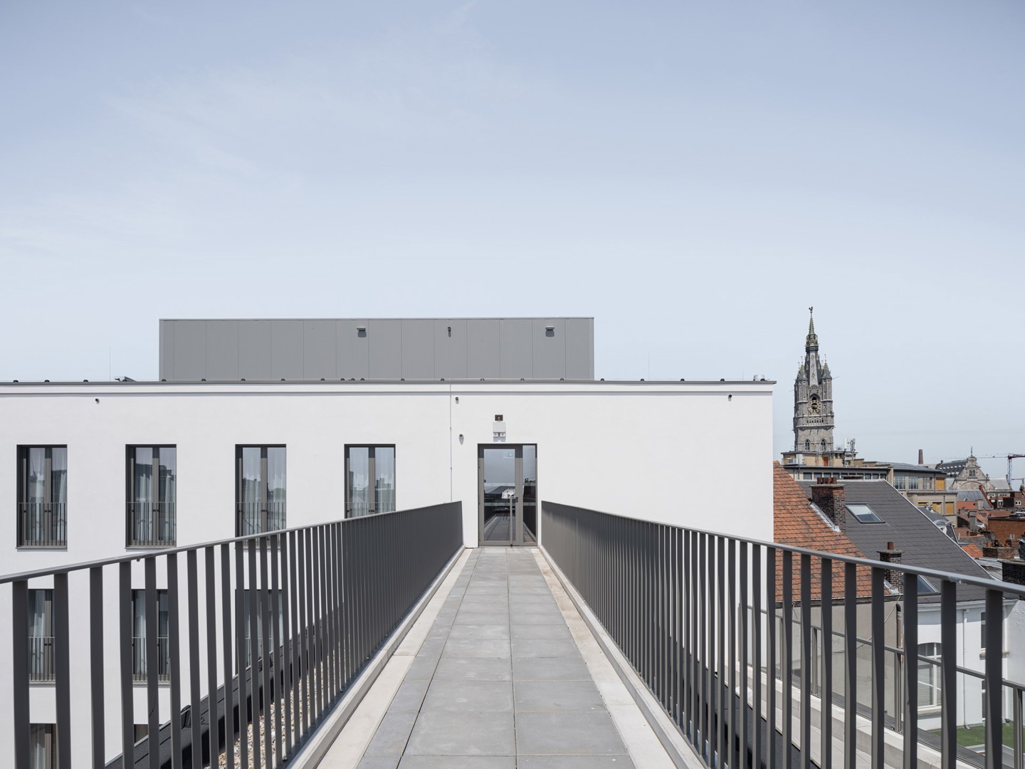 Naast een focus op circulair bouwen, was ook de specifieke ligging van het complex bepalend voor het ontwerp van Abscis Architecten. Zo hebben de ontwerpers ervoor gezorgd dat alle kamers uitzicht hebben op een van de omliggende straten of op een van de patio's. Alle zichtbare daken werden opgevat als daktuinen en het dakterras biedt een geweldig uitzicht over de stad. Door het gebouw visueel te openen ontstond er een grotere connectie met de torens van Gent, wat een grote toegevoegde waarde is voor de hotelbezoeker.