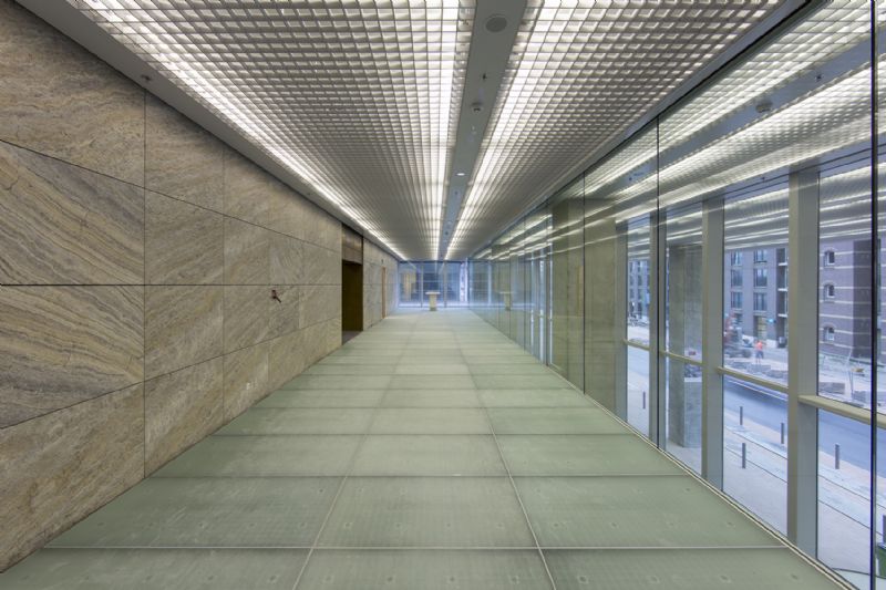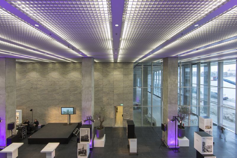 Om te voldoen aan de hoge akoestische eisen op het vlak van binnenklimaat zijn de panelen van het binnenplafond geperforeerd en voorzien van een akoestisch vlies om geluid te absorberen en zo de echo te minimaliseren. Het panelenplafond met hoge reflectiewaarde wordt boven een roosterplafond bevestigd. Tussen beide lagen bevinden zich de tl-armaturen die het licht optimaal diffuus in de ruimte verspreiden. Achter de reflecterende bovenlaag van het panelenplafond worden naast de installaties van licht ook deze van ventilatie weggewerkt.